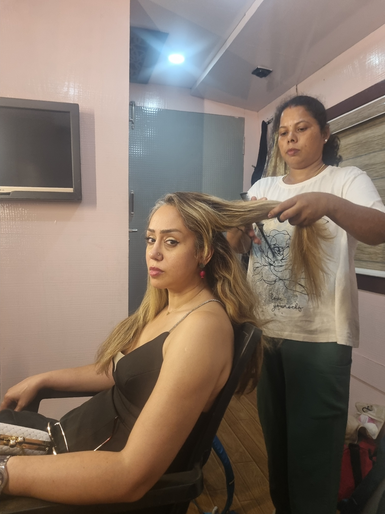 An indoor scene captures two women engaged in a hairdressing activity. In the foreground, on the right, a woman with long, highlighted blonde and light brown hair is seated, looking towards the viewer…read more