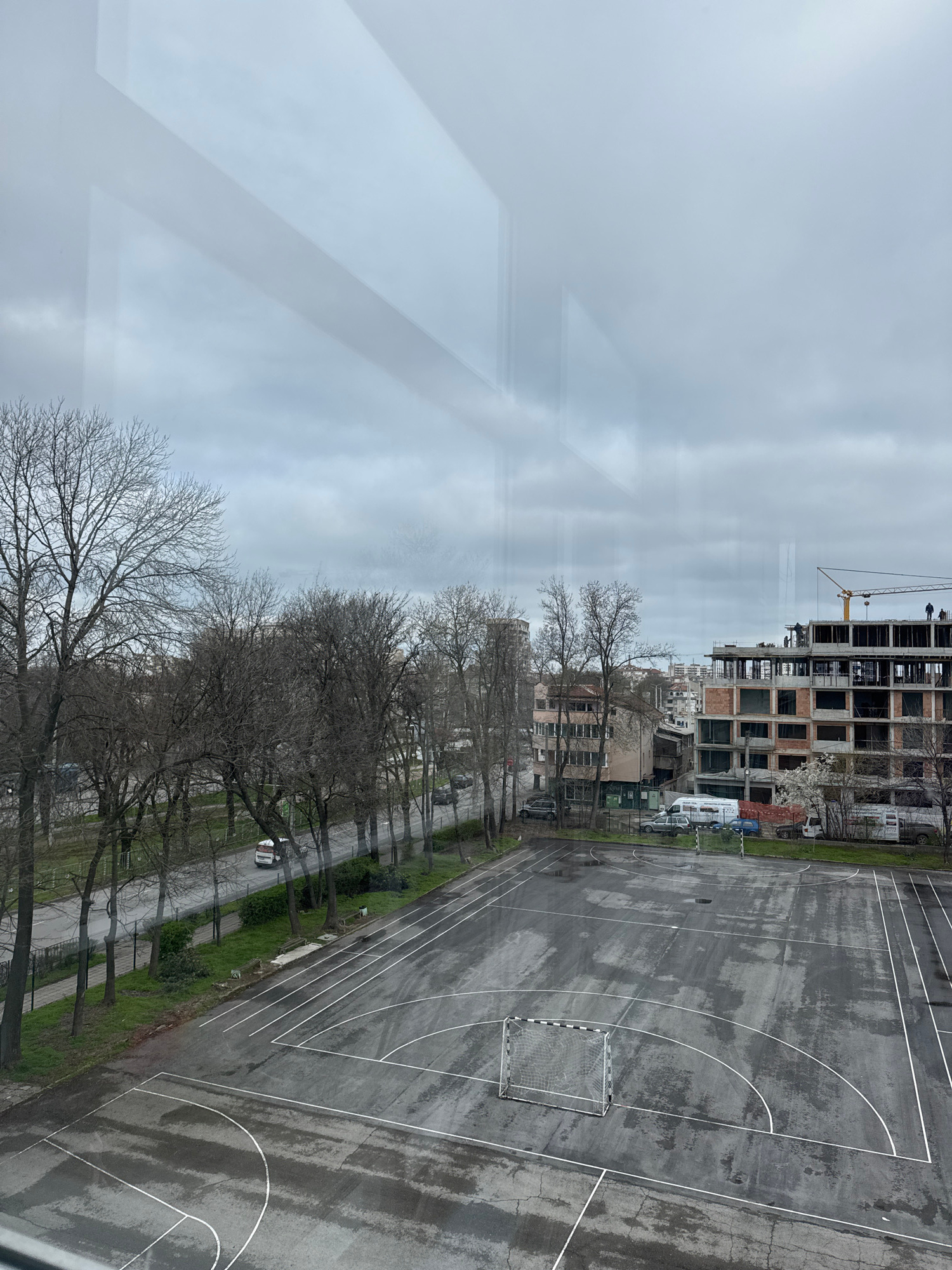 View from a high vantage point overlooking an outdoor basketball court and a street lined with trees. The basketball court is marked with white lines and features two goals with nets. Adjacent to the…read more
