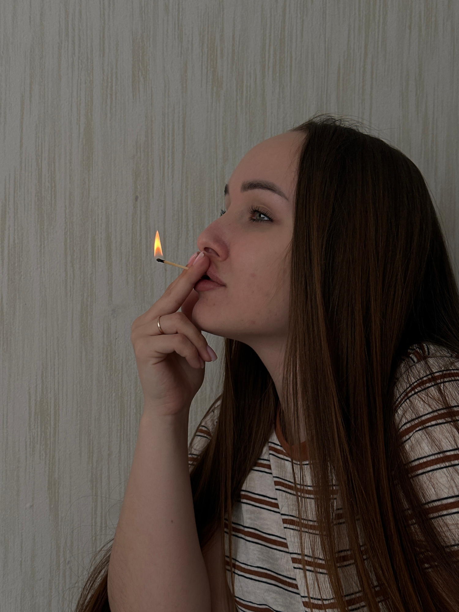 A woman with long brown hair is holding a lit matchstick to her lips. She has fair skin, a gold ring on her finger, and wears a striped shirt. The background is a light-colored surface that appears to…read more