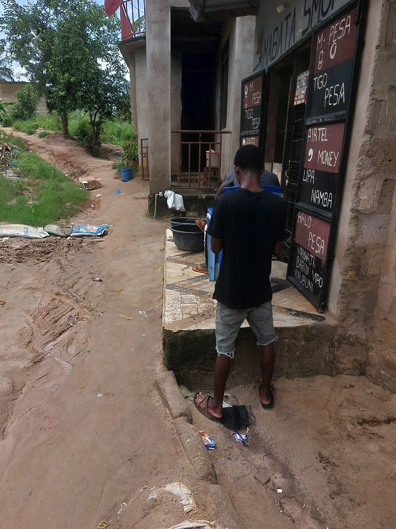 A man stands in front of a shop sign in Dar es-Salaam, Tanzania, advertising mobile money services. The sign lists various providers, including M-Pesa, Tigo Pesa, Airtel Money, Halo Pesa, LIPA, and NA…read more