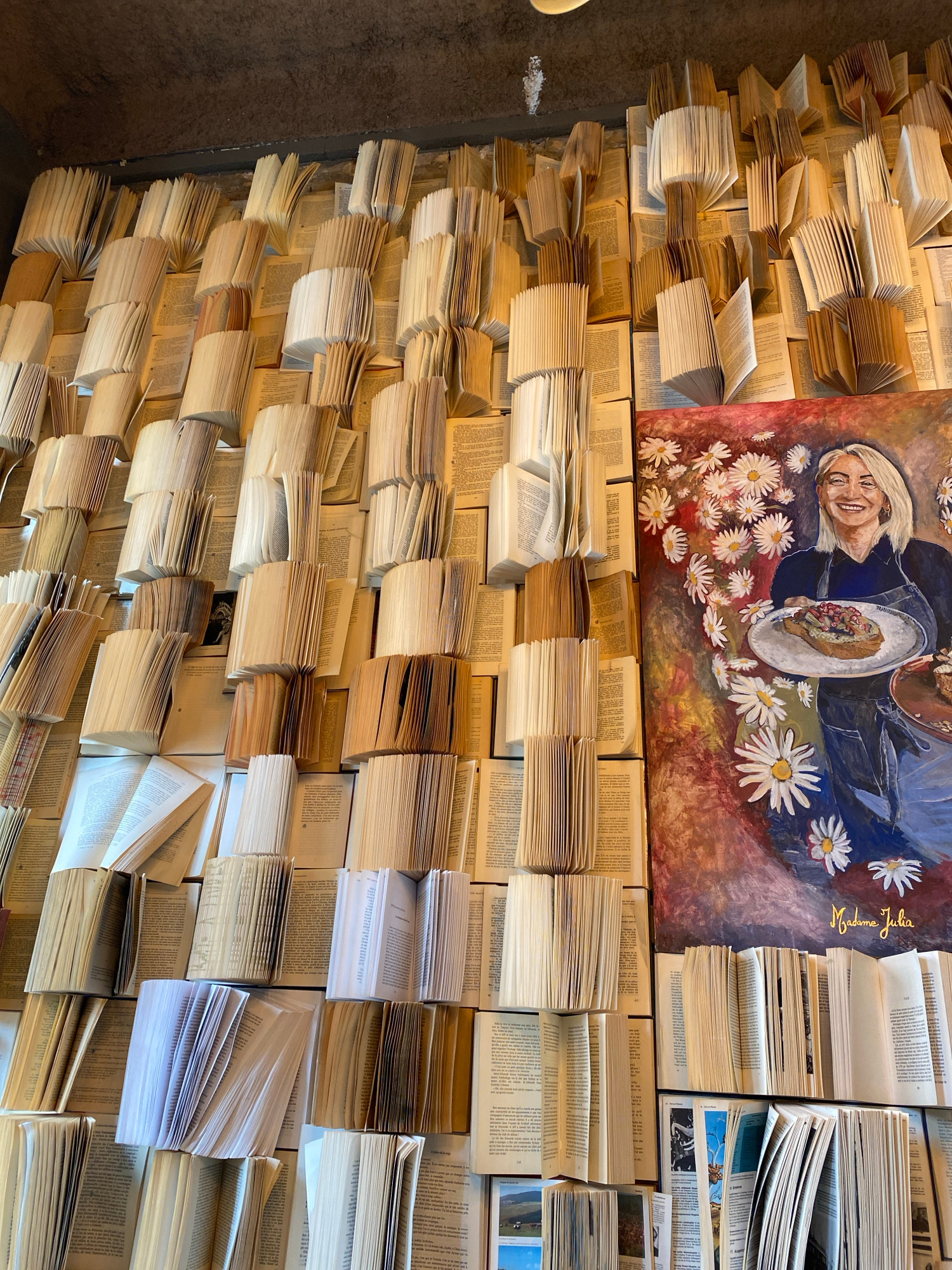 The image displays an artistic wall installation, likely within an interior space in Strasbourg, France. The main subject is a large painting centered towards the top, set against a wall extensively c…read more