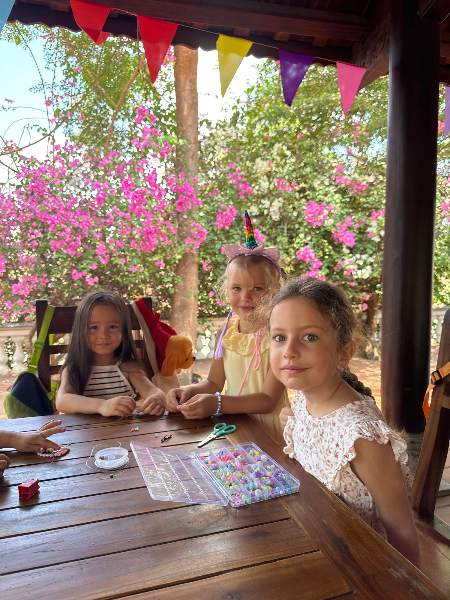 Three girls are sitting at a wooden table. The girl closest to the camera is wearing a white dress with small flowers. The second girl has a rainbow unicorn horn headband and is wearing a yellow dress…read more