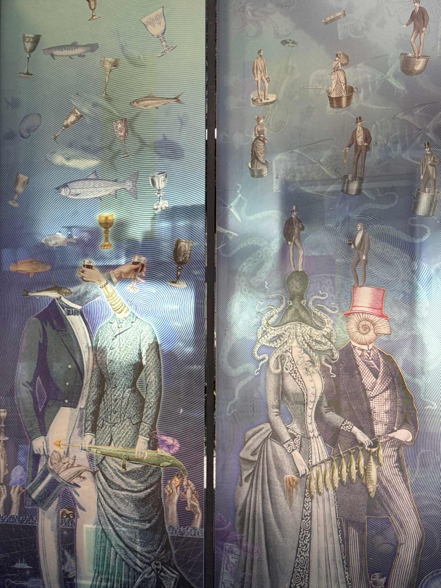 This surreal diptych artwork presents a fantastical, dreamlike underwater or otherworldly scene, rendered in a collage style combining vintage illustrations with textured backgrounds. The dominant col…read more