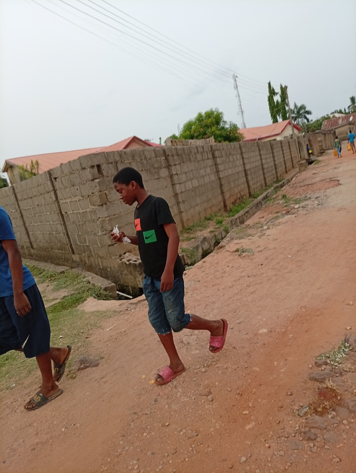 A street scene in Adankolo, Nigeria. A young boy in a black t-shirt with an orange, red and green patterned rectangle, rolled-up denim shorts, and pink sandals walks on a dirt road. He holds a white object in his left hand. Another person wearing a blue t-shirt and dark blue shorts walks to his left. In the distance, several people walk along the road. A concrete block wall borders the road. Buildings with red roofs are visible behind the wall. Power lines stretch across the sky, and a cell tower stands in the background. The ground is dry and dusty. | Open Wire