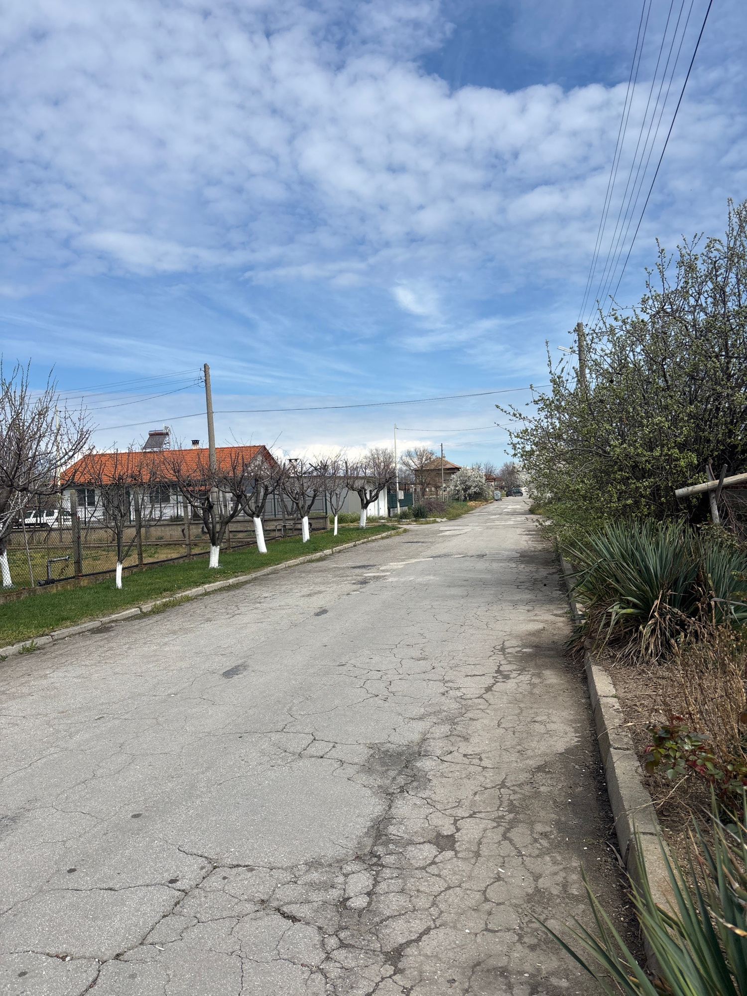 The image shows a street in Dobrovnitsa, Bulgaria, viewed from the perspective of someone standing on the edge of the road. The road surface is cracked and shows signs of wear. On the right side of thβ¦read more