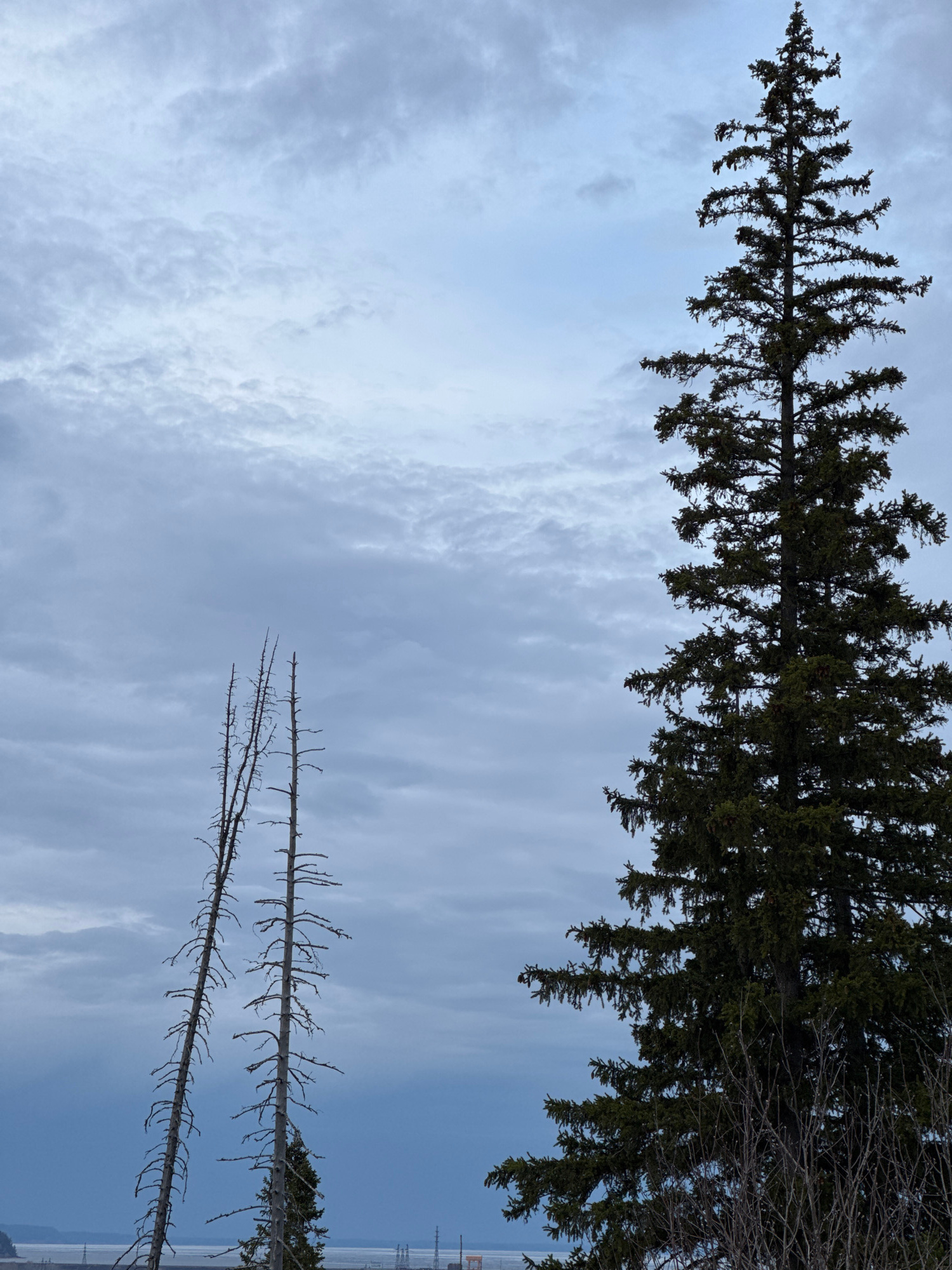 The image shows a view of the sky framed by trees. At the top, a large evergreen tree with dense foliage spans the width of the scene. Below, two bare, slender trees reach upwards, their branches star…read more