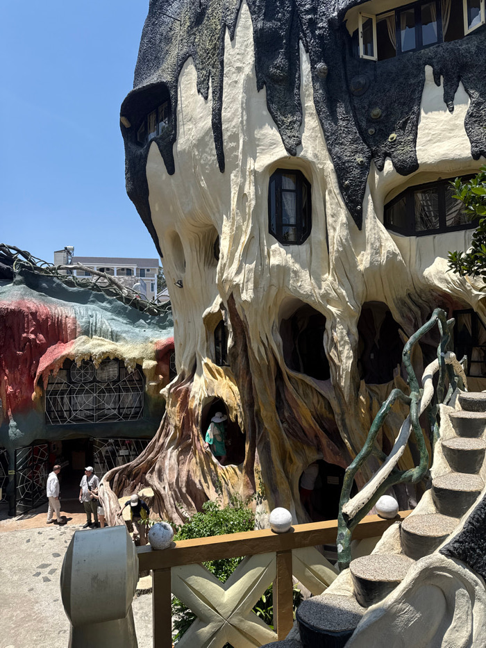 The image depicts a detailed view of the Hằng Nga Guesthouse, commonly known as the "Crazy House," in Da Lat, Vietnam. The primary subject is an unconventional, multi-story building designed with orga…read more