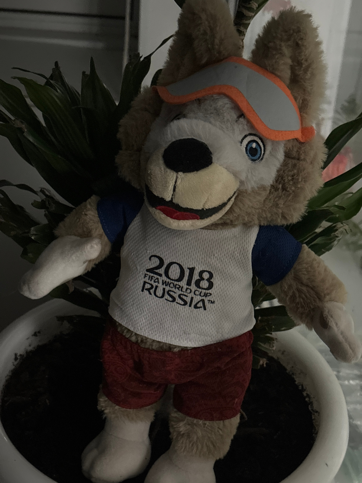 A plush toy of Zabivaka, the mascot of the 2018 FIFA World Cup in Russia, is resting among the leaves of a plant inside a white pot. The toy is dressed in a white t-shirt with the "2018 FIFA World Cup…read more