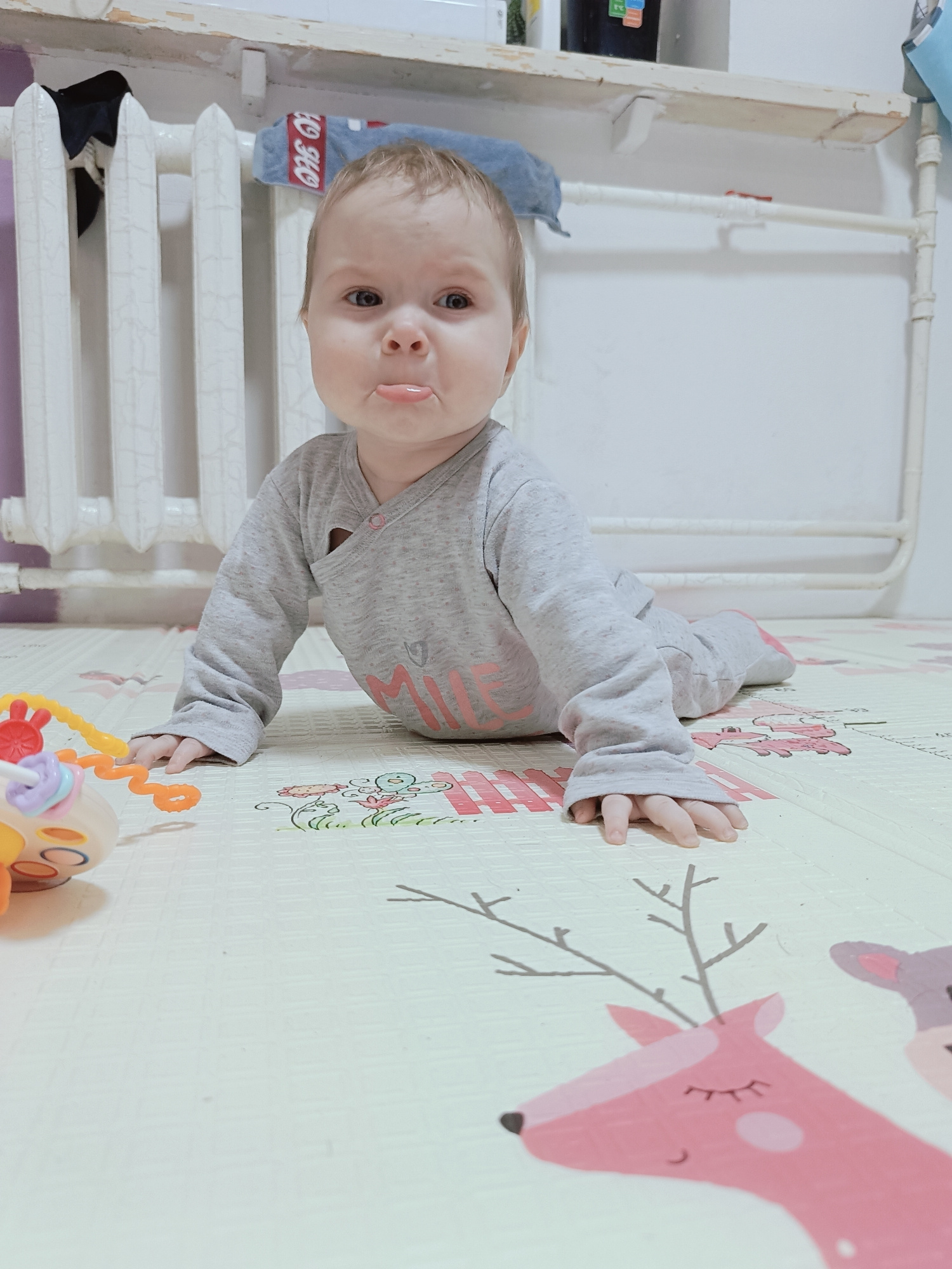 A baby wearing a grey pajama set is lying on its stomach on a light-colored playmat decorated with cartoon animals, including a pink deer. The baby is in the foreground, with its head raised and tongu…read more