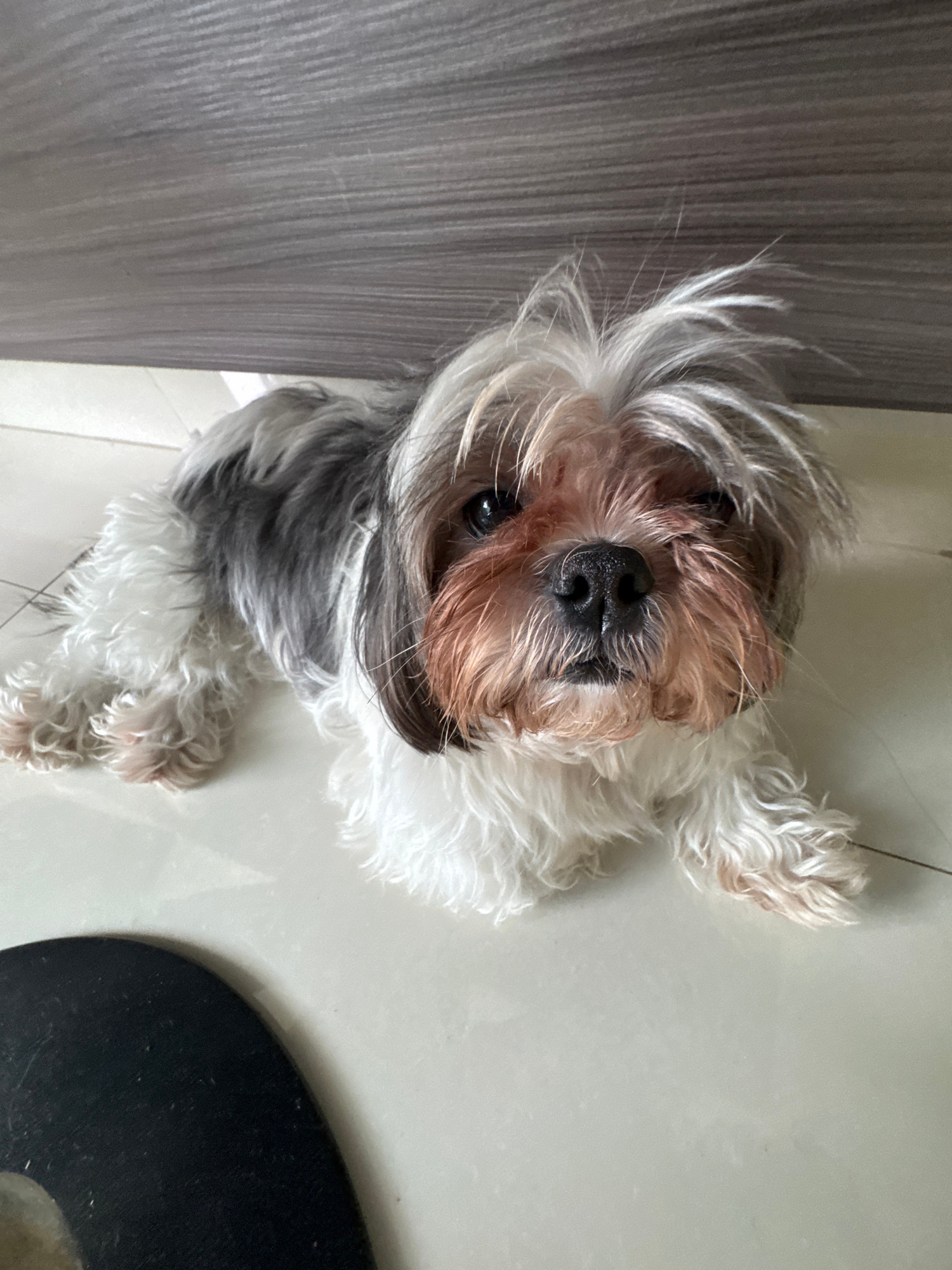 A small, long-haired dog, possibly a Yorkshire Terrier mix, is lying on a light-colored tile floor. The dog has white, gray, and tan fur, with a black nose. Part of a gray wooden cabinet is visible on…read more
