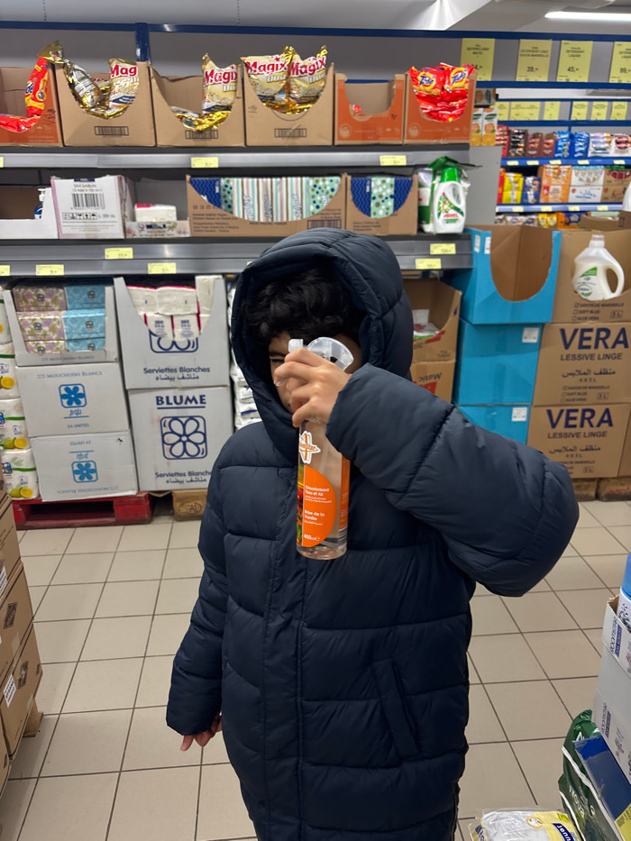 In a store aisle, a person in a puffy blue jacket sprays an orange bottle. Shelves hold a variety of products including "Magix" snack packs, patterned boxes, and white "Blume" tissues. Taller boxes of…read more