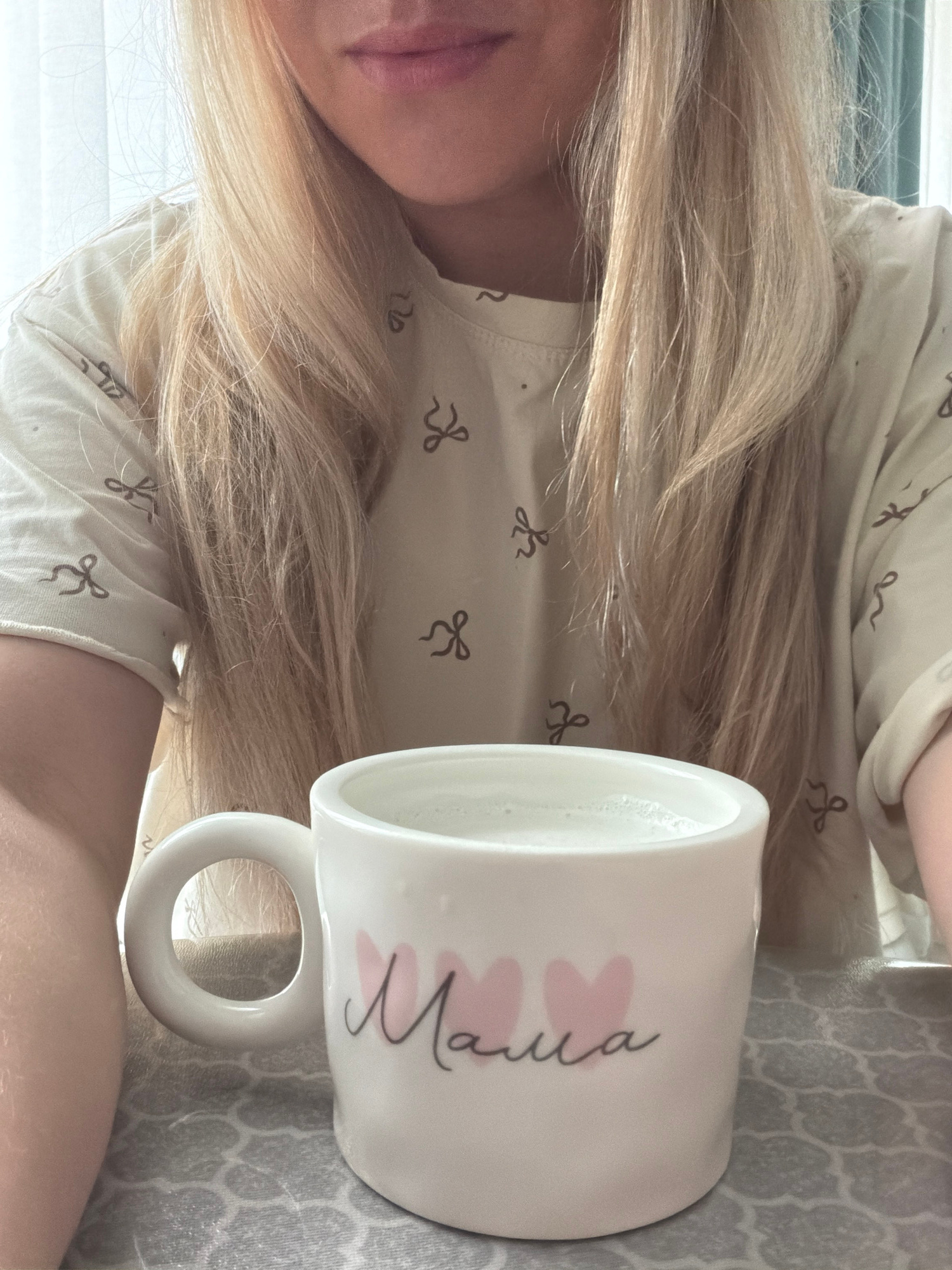 A selfie-style image shows a person with long, blonde hair lying down. The person's lips are visible in the left portion of the frame. They are wearing a light-colored shirt with a pattern of small, s…read more