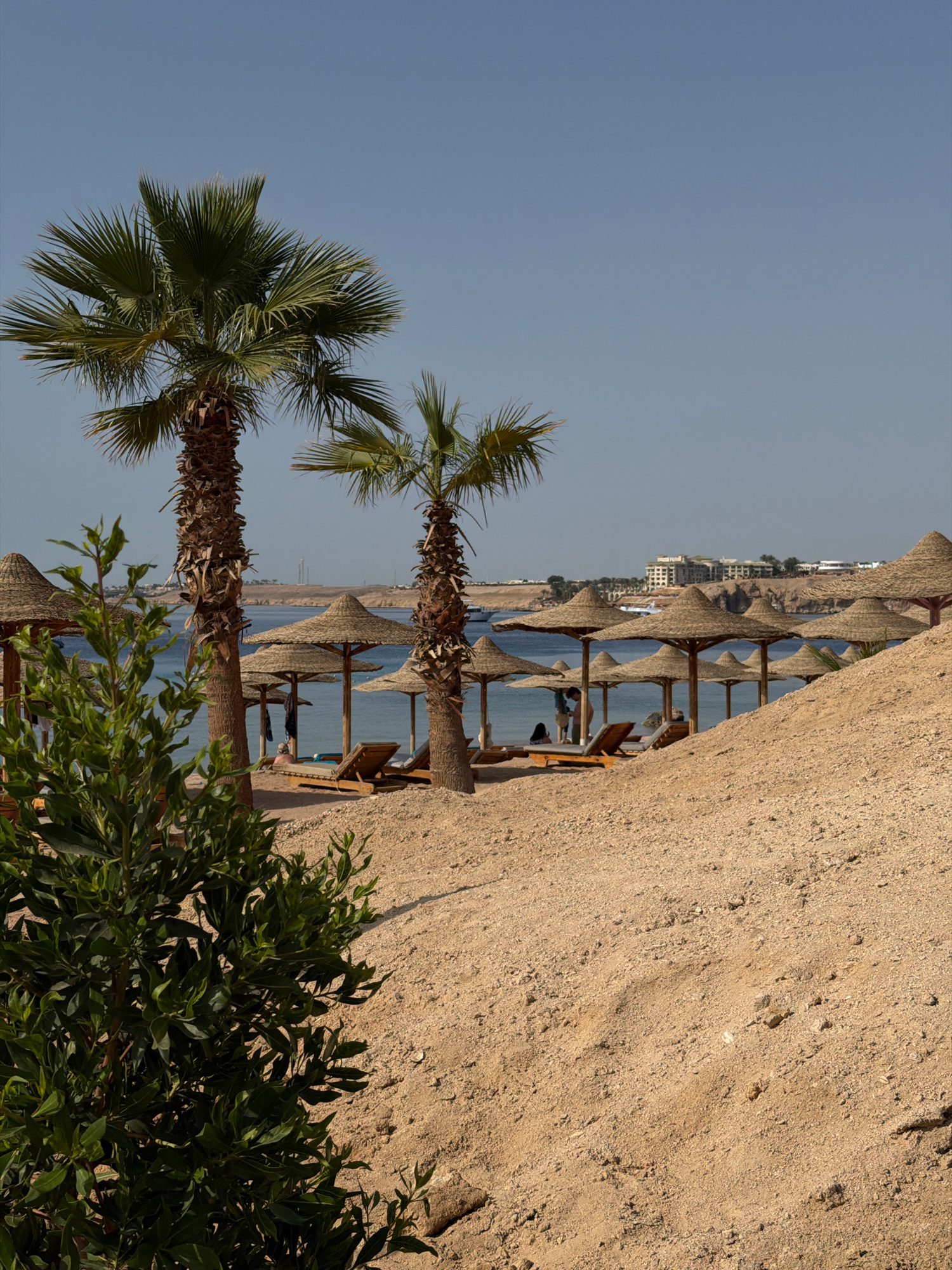 The image captures a beach scene likely in Sharm El Sheikh, Egypt, showcasing palm trees, straw umbrellas, and a sandy cliff. Several people are seen on the beach near the umbrellas. The environment c…read more