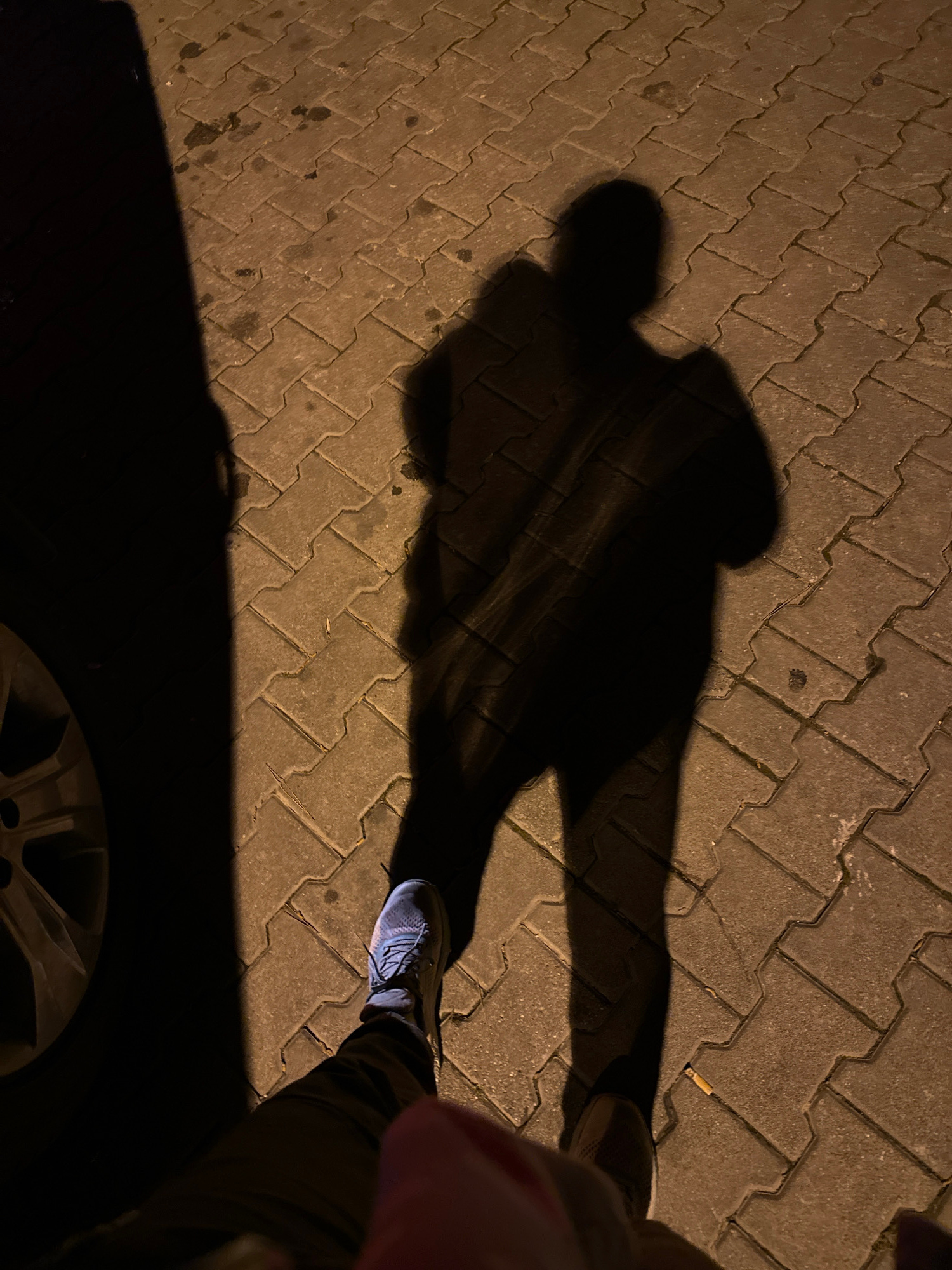 The image shows a low-angle, nighttime view of a brick-paved surface with the shadow of a person. The individual's shadow is elongated and falls across the bricks, with their feet positioned towards t…read more