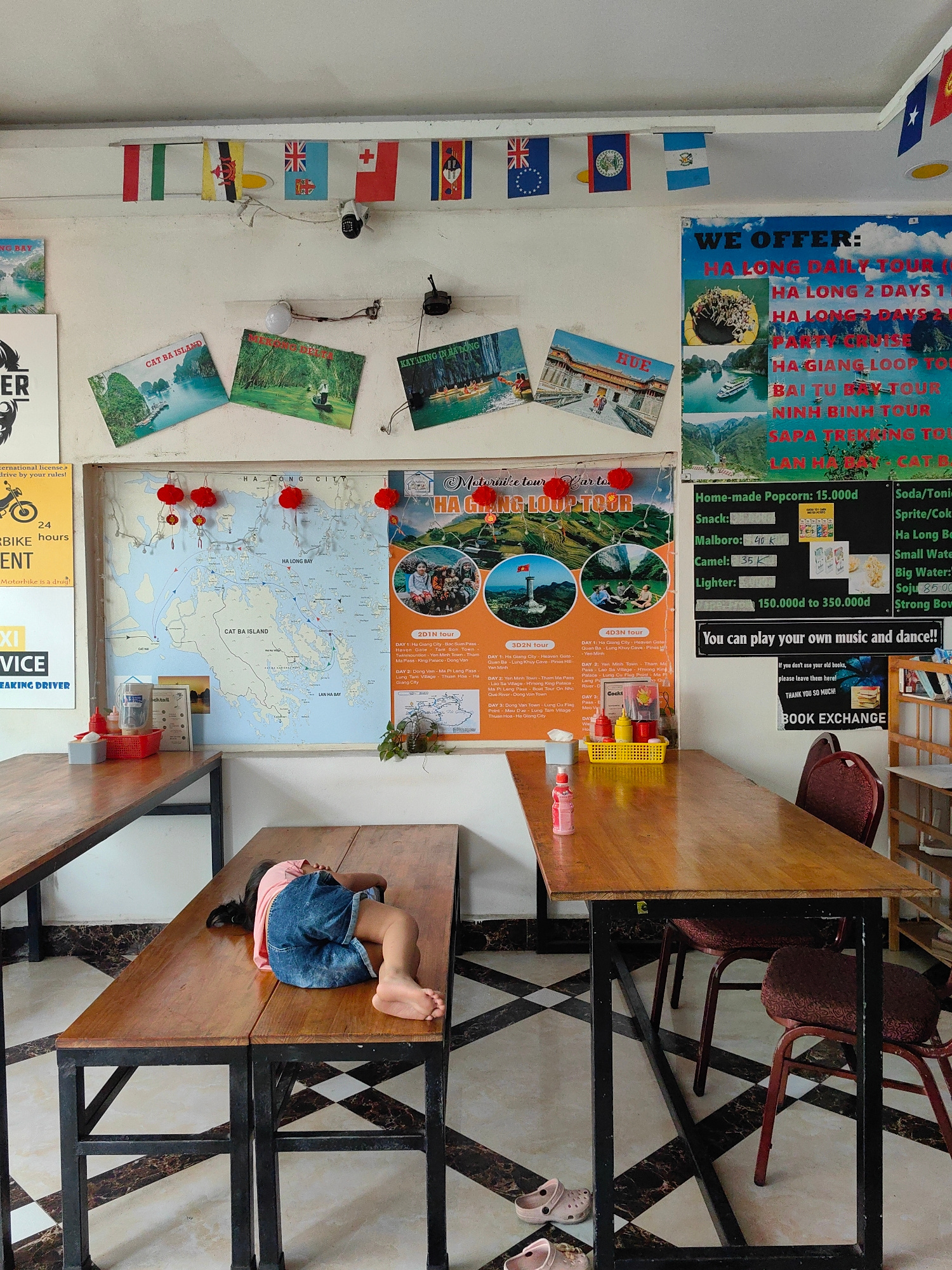 A young child sleeps on a wooden bench in a brightly lit room in Bai Chay Ward, Vietnam. The room appears to be a travel agency or tourist information center. Various flags hang near the ceiling, and…read more