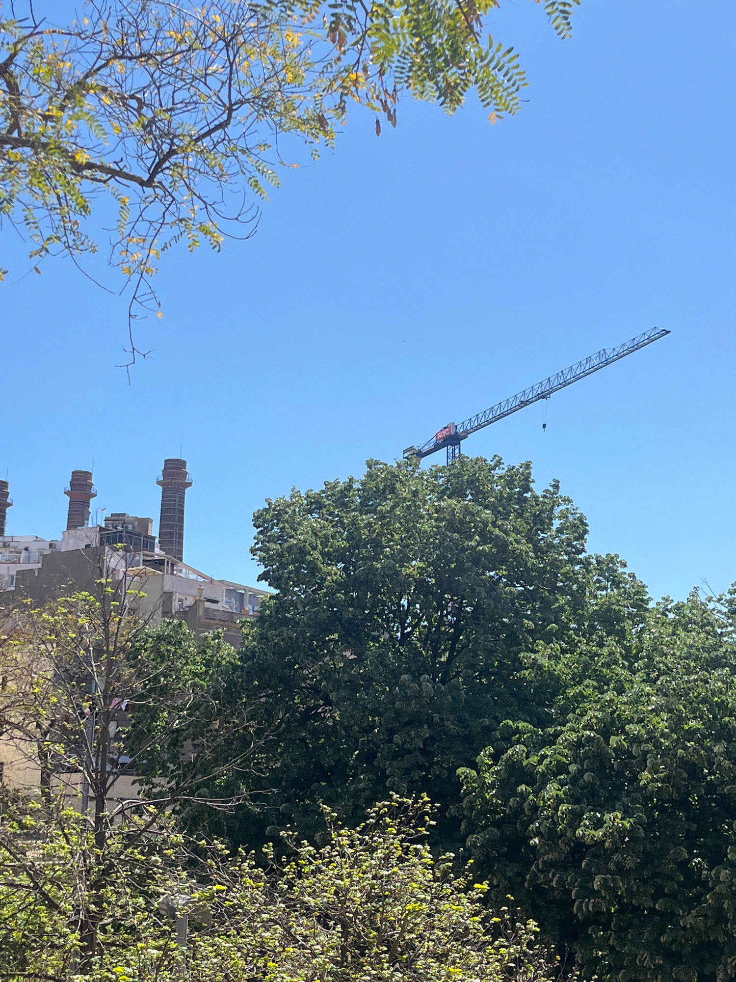 The image, viewed horizontally, presents an urban landscape under a clear, bright blue sky, suggesting daytime with good weather. A large construction crane, featuring a dark-colored lattice structure…read more