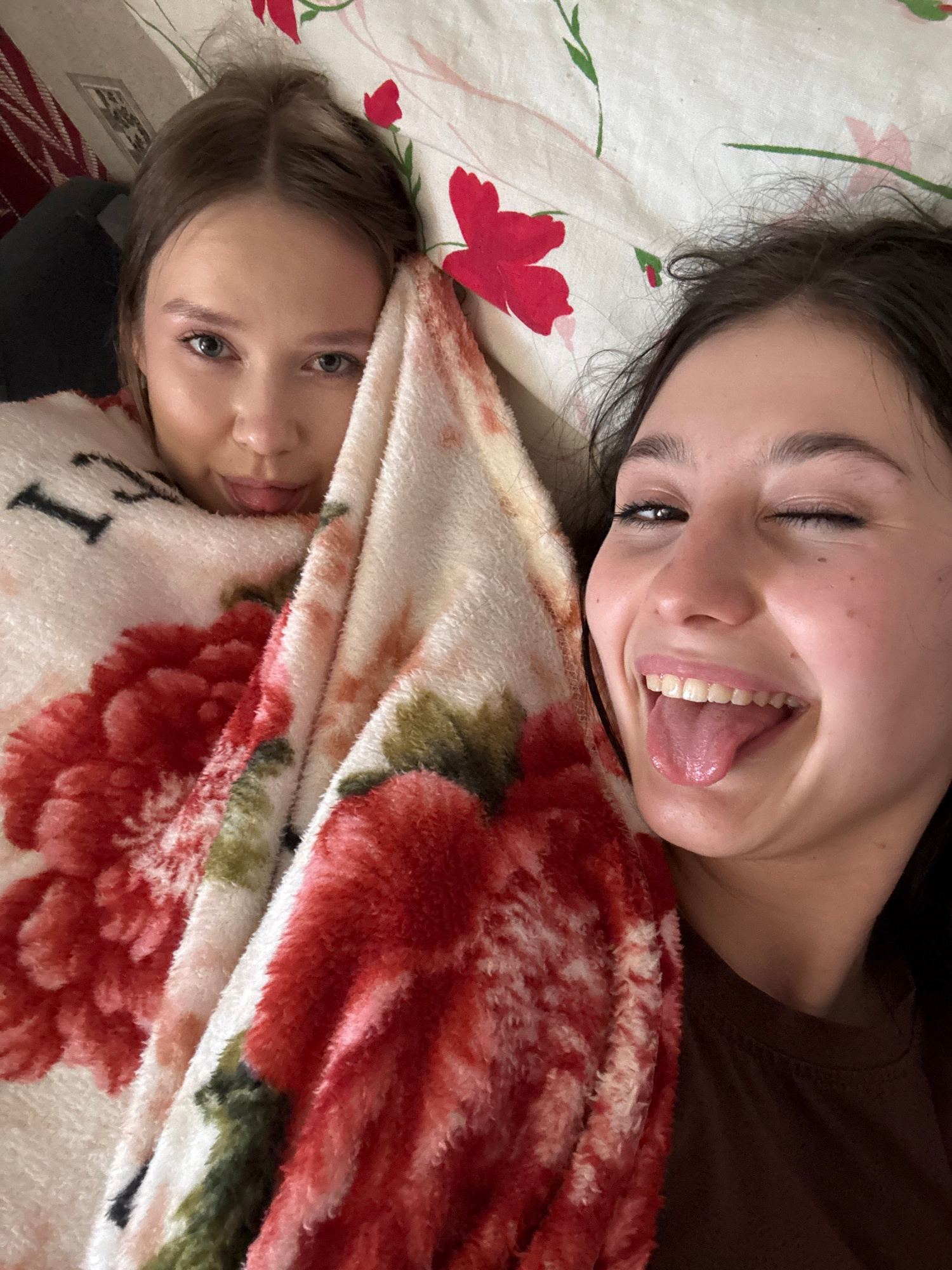 Two young women are lying down next to each other. One is lying on top with her tongue out and smiling. The other is lying beneath a floral blanket, looking at the camera. They are both lying on a pat…read more