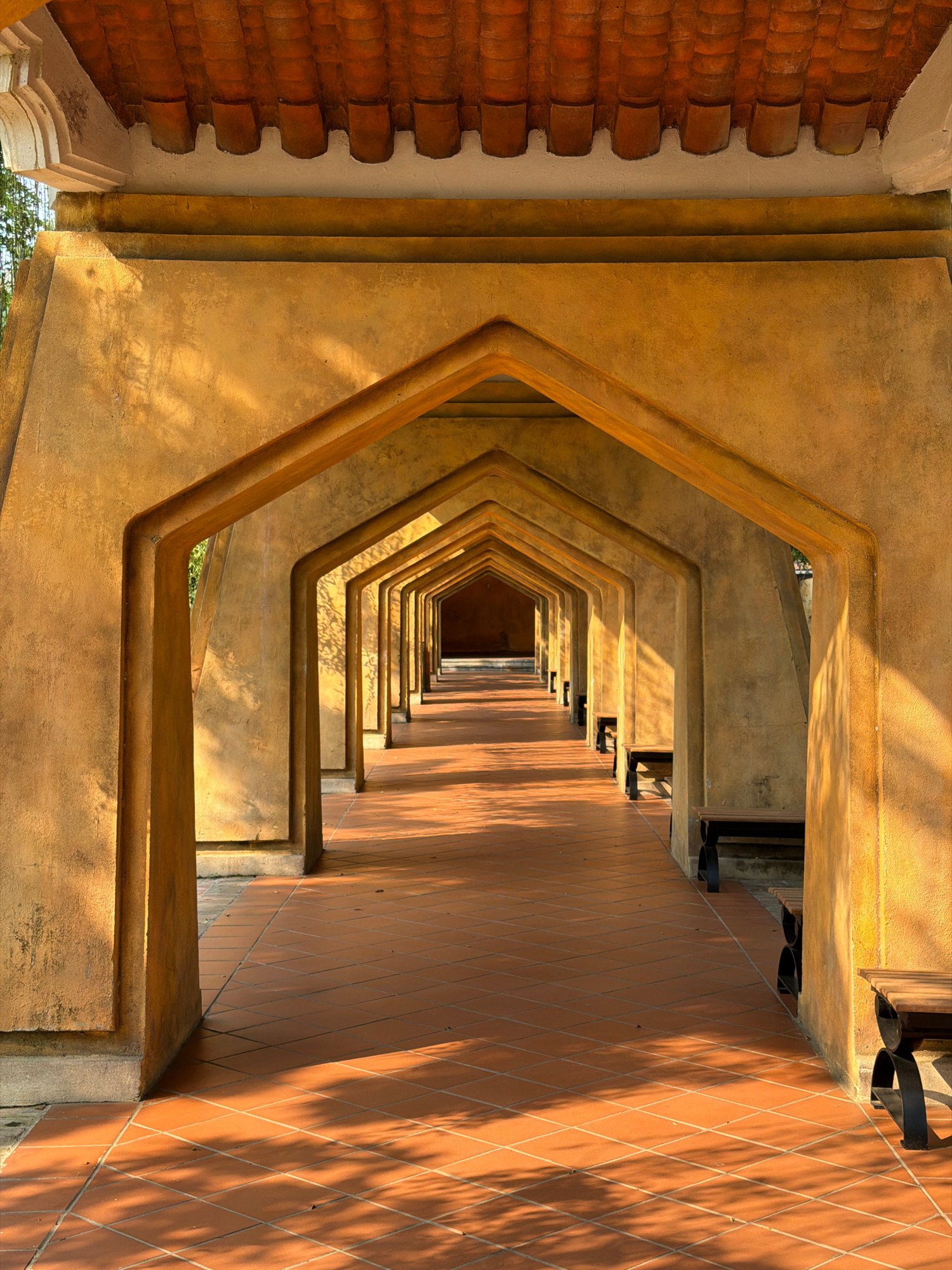 This photograph presents a ground-level perspective of a colonnade in what is most likely the city of Đà Nẵng, Vietnam. The structure features repeating angular archways leading into the distance, for…read more