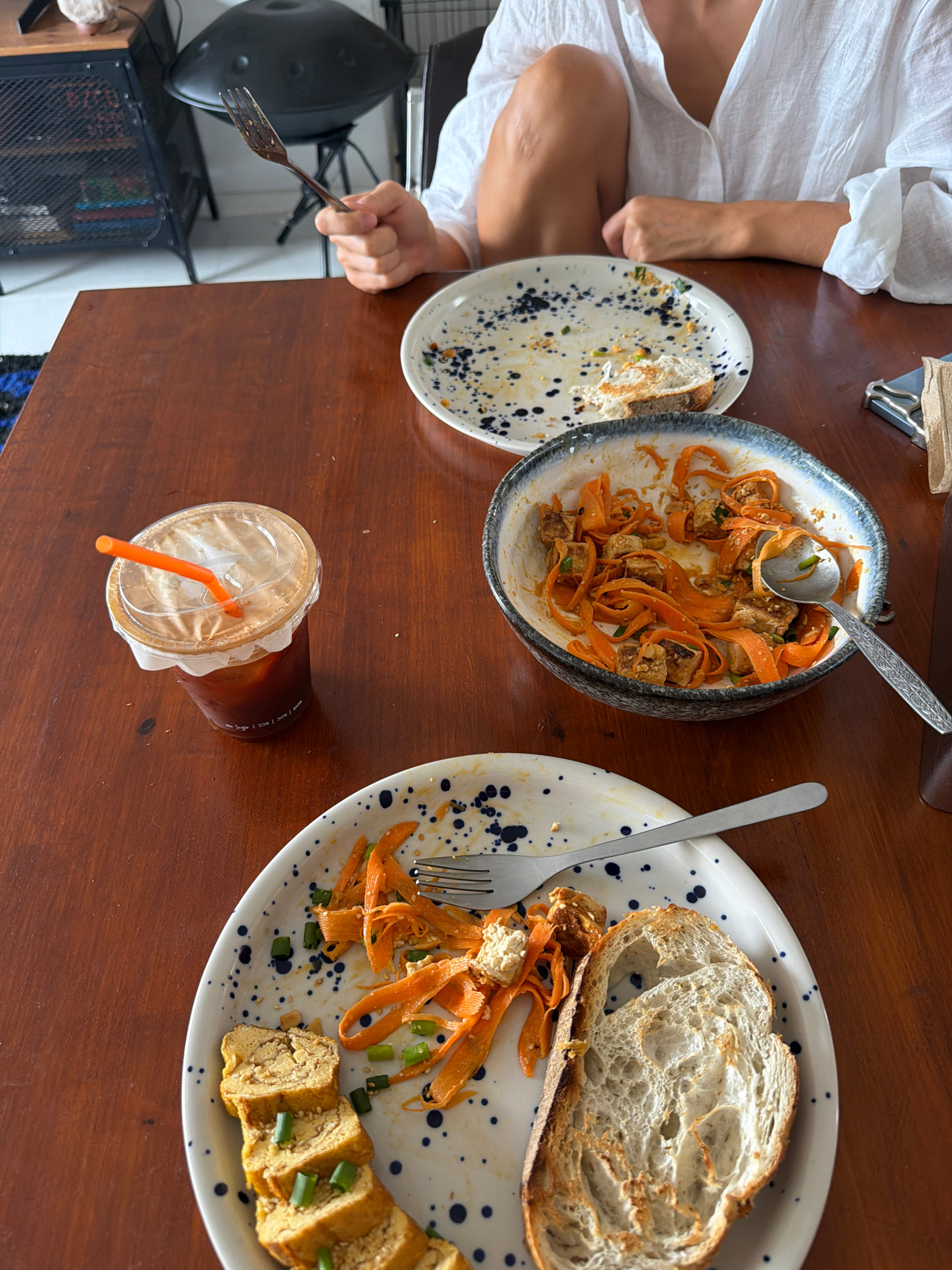 The image provides an overhead view of a person enjoying a meal at a dark wooden table in an indoor setting, likely a cafe or restaurant in Chang Phueak, Thailand. A person, visible from the torso dow…read more