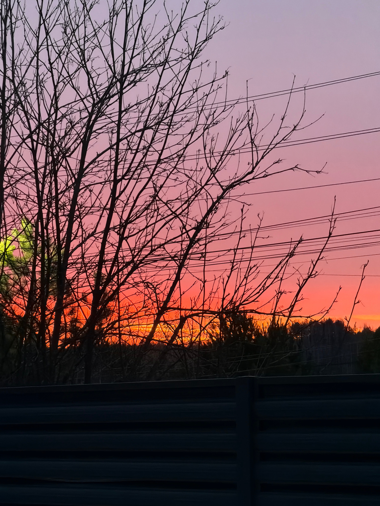 The image depicts a sunset scene in Markovo, Russia. A bare tree with numerous thin branches is silhouetted against the sky, which transitions from pale pink at the top to vibrant orange near the hori…read more