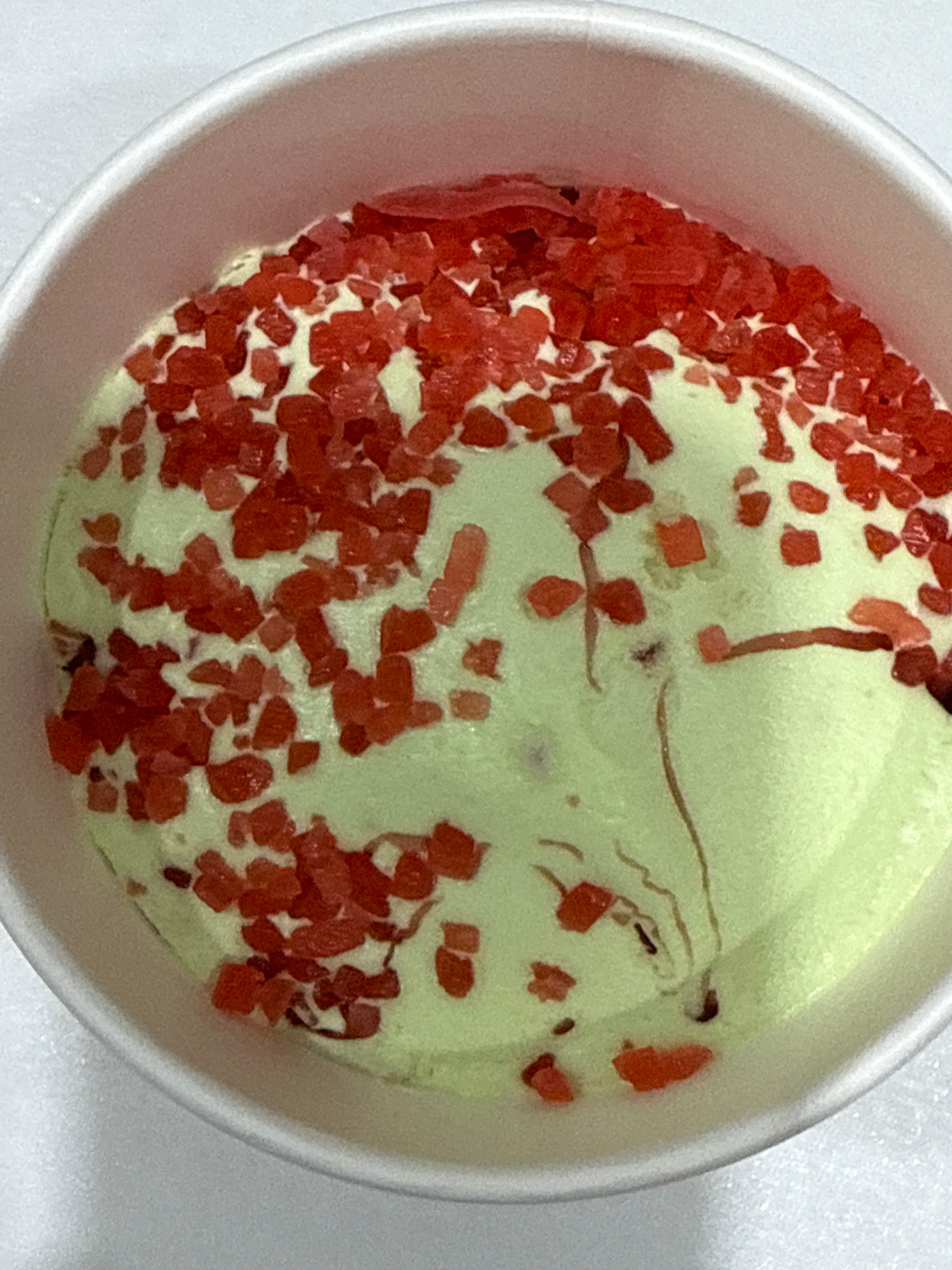 A close-up shot from above shows a white paper cup filled with pale green ice cream. The ice cream is topped with small, red, square sprinkles. There are slight brown swirls within the ice cream. Theβ¦read more