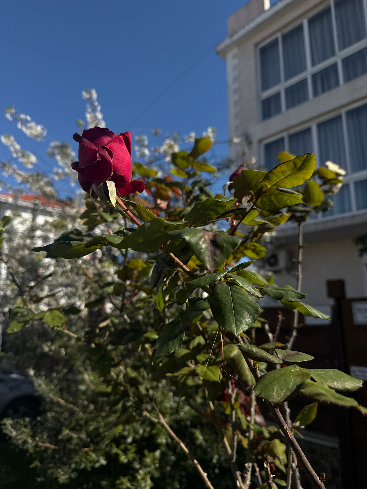 A close-up, outdoor shot, taken on a clear, sunny day in Sochi, Russia, features a single, deep red rose bud. The rose is still partially closed, showcasing its velvety petals, and is positioned towar…read more