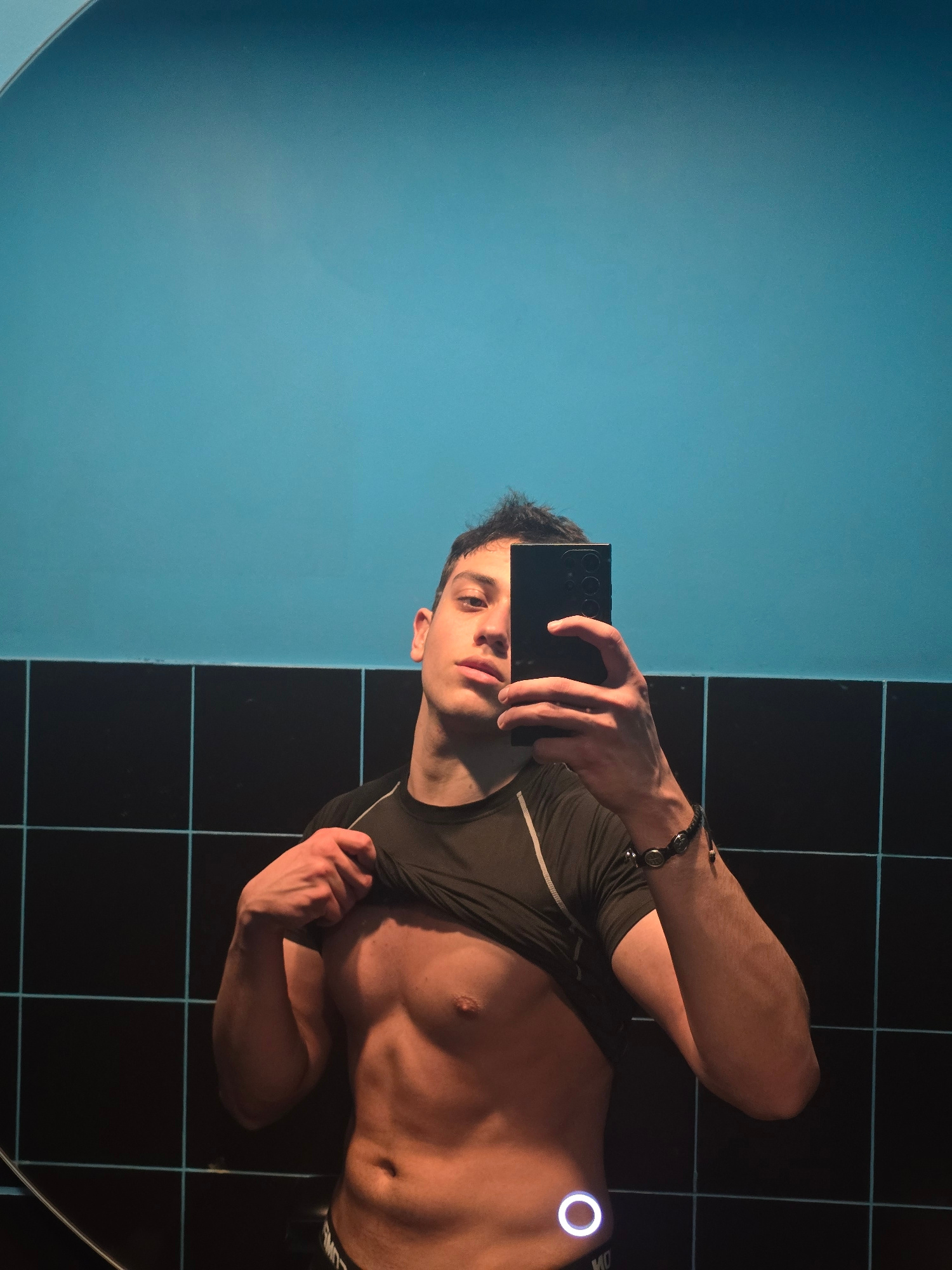 A man is taking a selfie in what appears to be a bathroom setting. He is holding a smartphone in his right hand, obscuring part of his face. He is wearing a dark-colored athletic shirt that is partial…read more