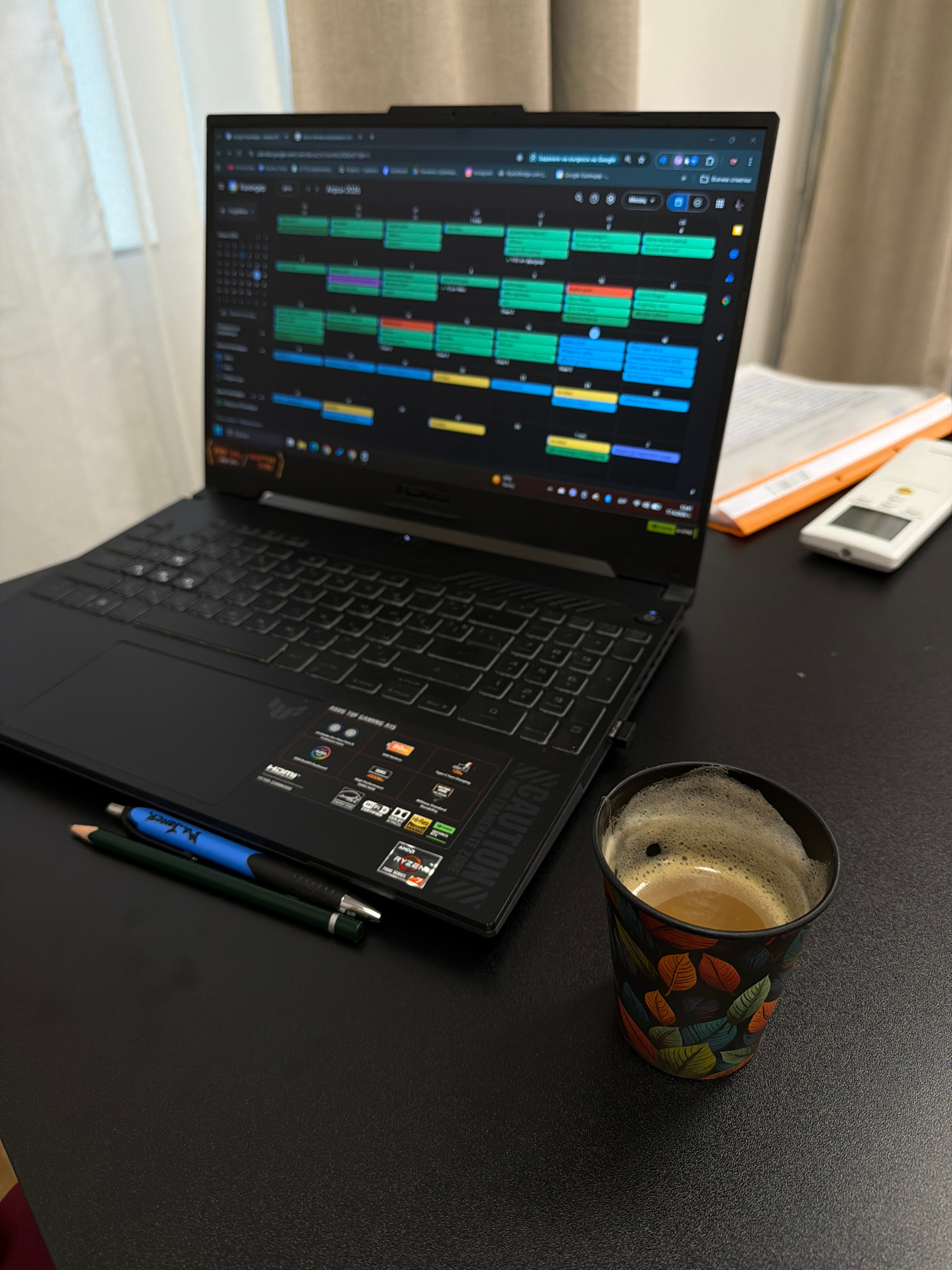 The media file presents an overhead view of a black desk in Kalofer, Bulgaria, set up as a workspace. The central subject is an open black ASUS TUF Gaming A15 laptop, angled slightly towards the left.…read more