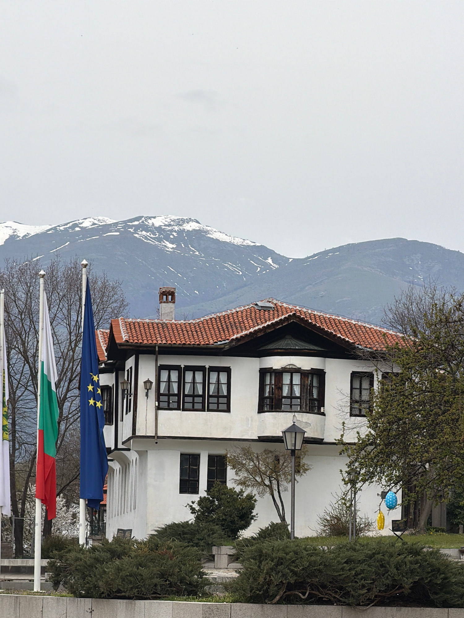 The image shows the "Hristo Botev" National Museum in Kalofer, Bulgaria, with a mountain range visible in the background. The museum is a two-story white building with a red-tiled roof and black-frame…read more