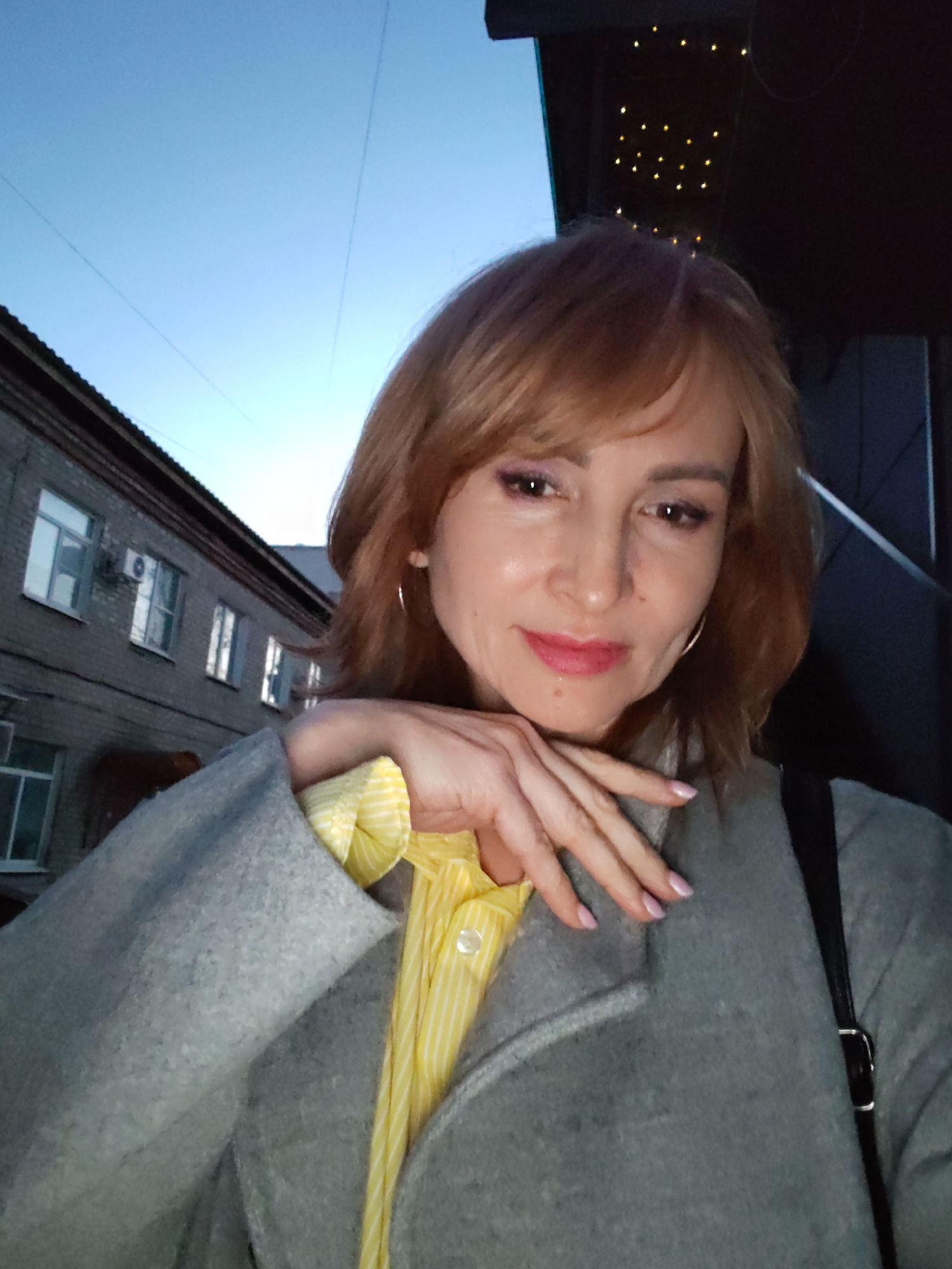 A woman with reddish-brown, shoulder-length hair and bangs poses for a photo in an outdoor setting in Chaikovsky, Russia. She has fair skin, pink lipstick, and visible pink eyeshadow, with small hoop…read more