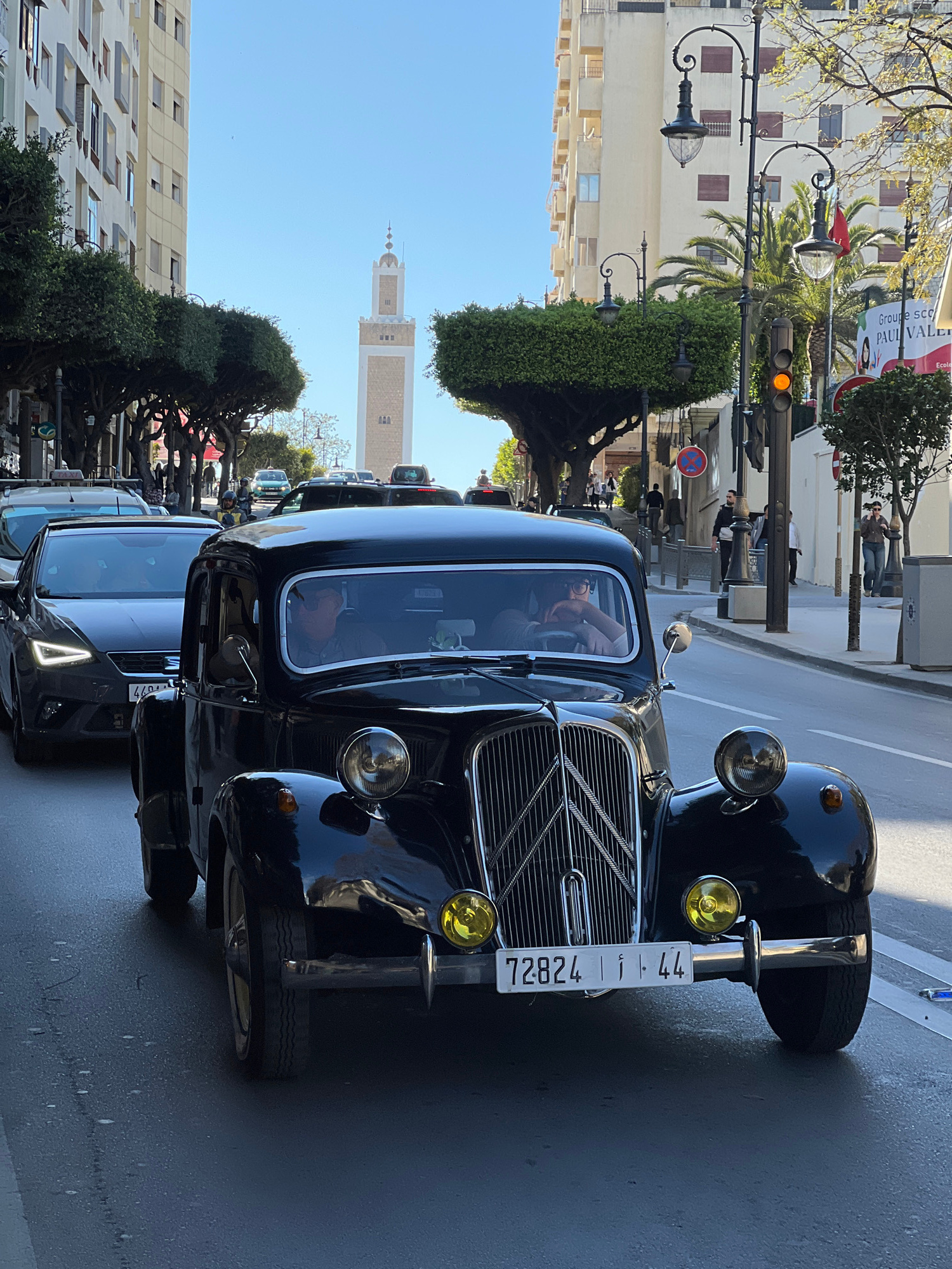 A black vintage car is parked on a street in Tangier, Morocco. The license plate reads "72824 أ 44". The car is flanked by modern vehicles. The street is lined with trees and buildings. In the backgro…read more