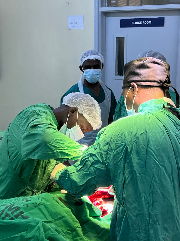 The image depicts an active surgical procedure taking place within a hospital operating room in Nairobi, Kenya. Four individuals, consistent with medical professionals, are present. Two surgeons, dres…read more