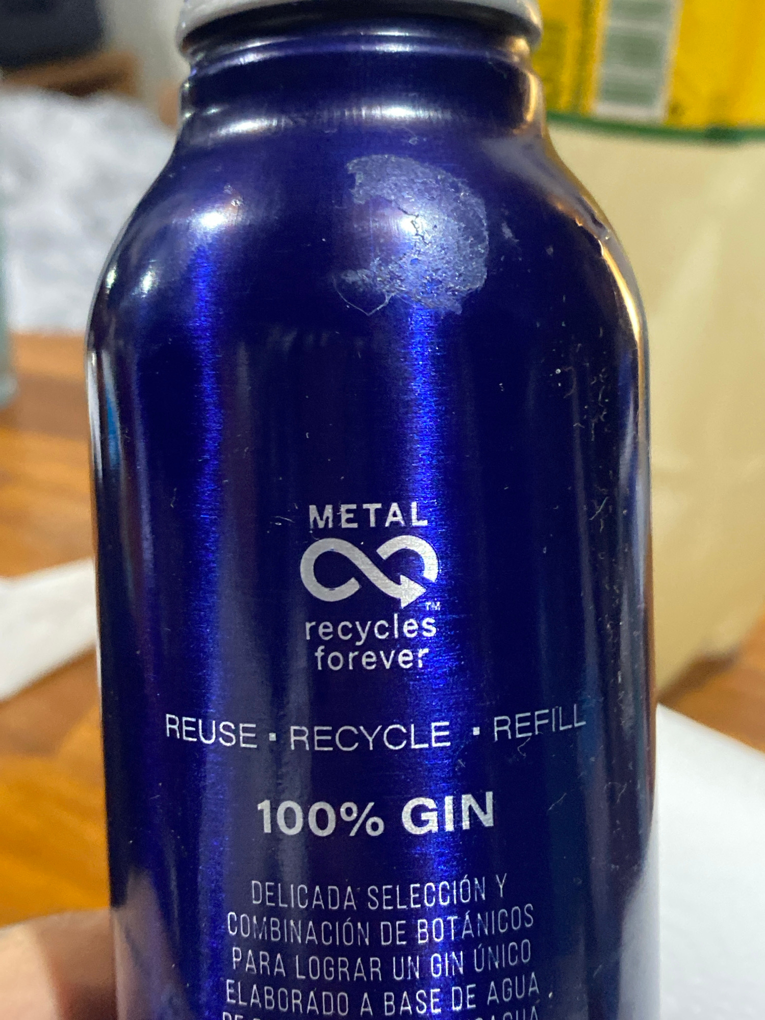 An eye-level, close-up shot captures a blue metallic bottle, likely made of aluminum, lying horizontally on what appears to be a light-colored surface, possibly a wooden table or countertop. The bottl…read more