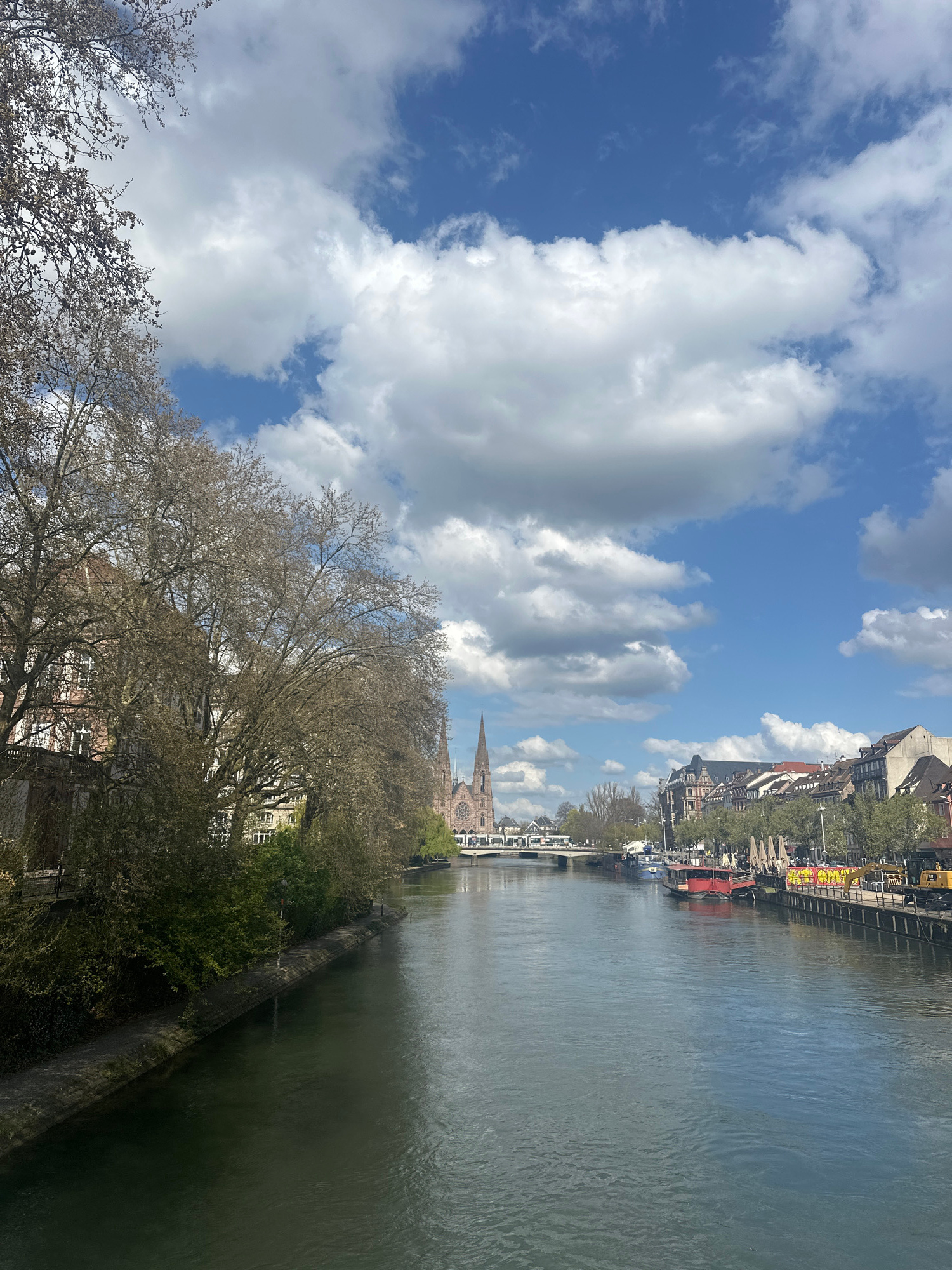 This image captures a view in Strasbourg, France, along the Ill River. A church steeple is visible above trees, likely belonging to the Église Saint-Paul. The river is flanked by buildings and trees o…read more