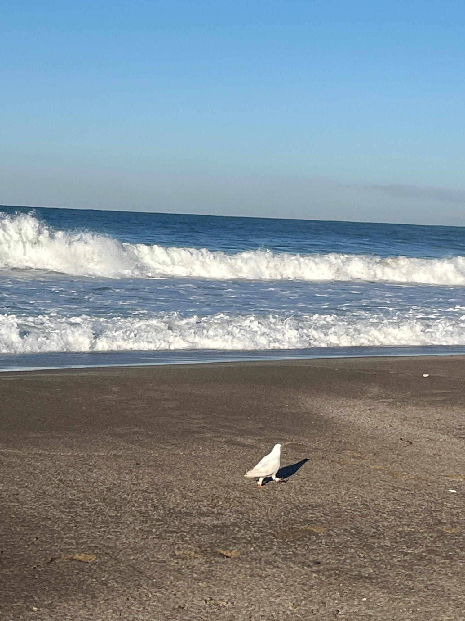 The image shows a beach scene, likely in Alanya, Turkey, given the presence of a dark sand beach, crashing waves of the Mediterranean Sea, and a clear blue sky. On the right side of the frame is a clo…read more
