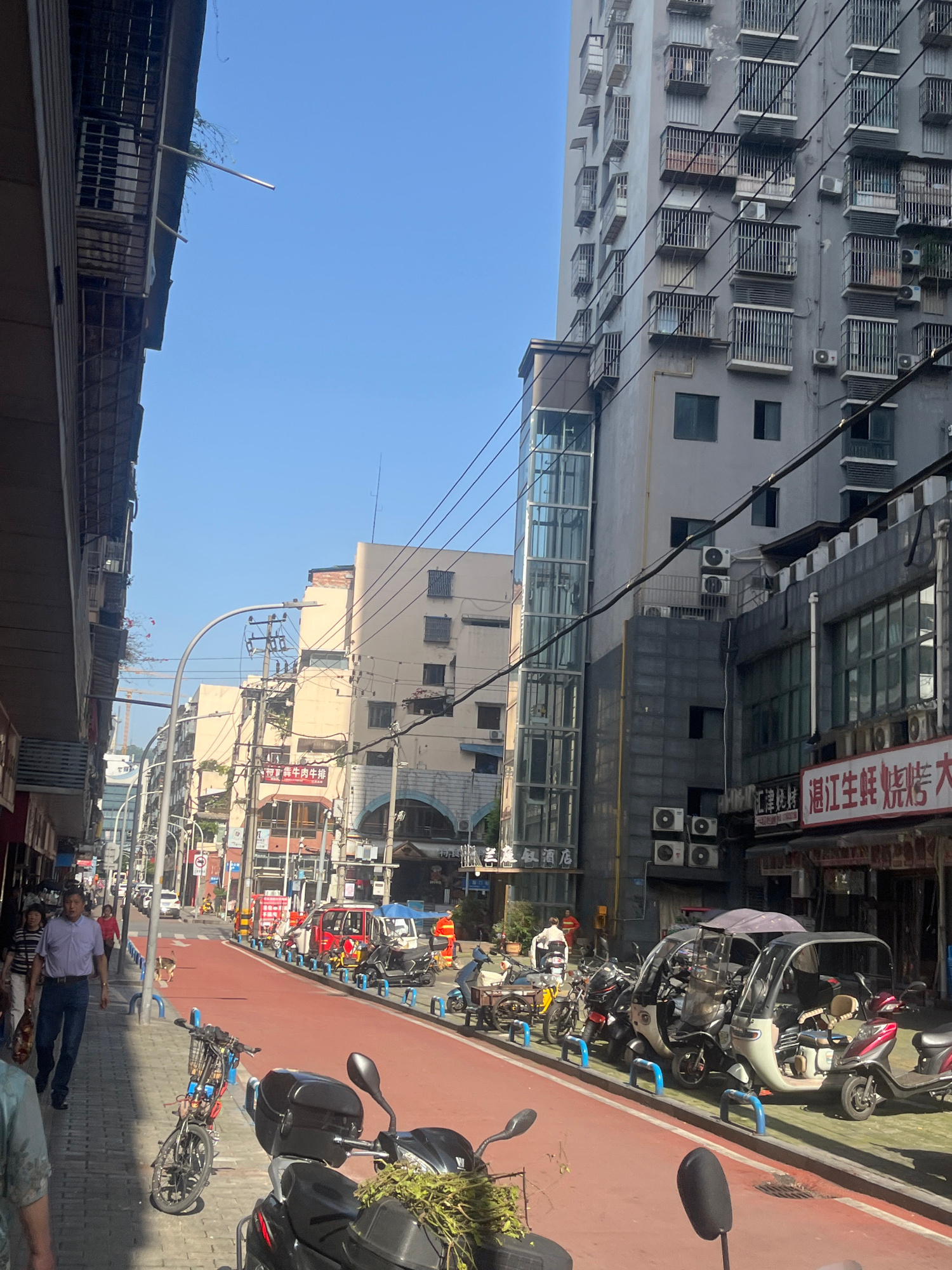 This photograph captures a vibrant street scene in an urban environment, likely in Jiangjin, China, given the provided context. The image is oriented with the clear blue sky on the left, but if rotate…read more
