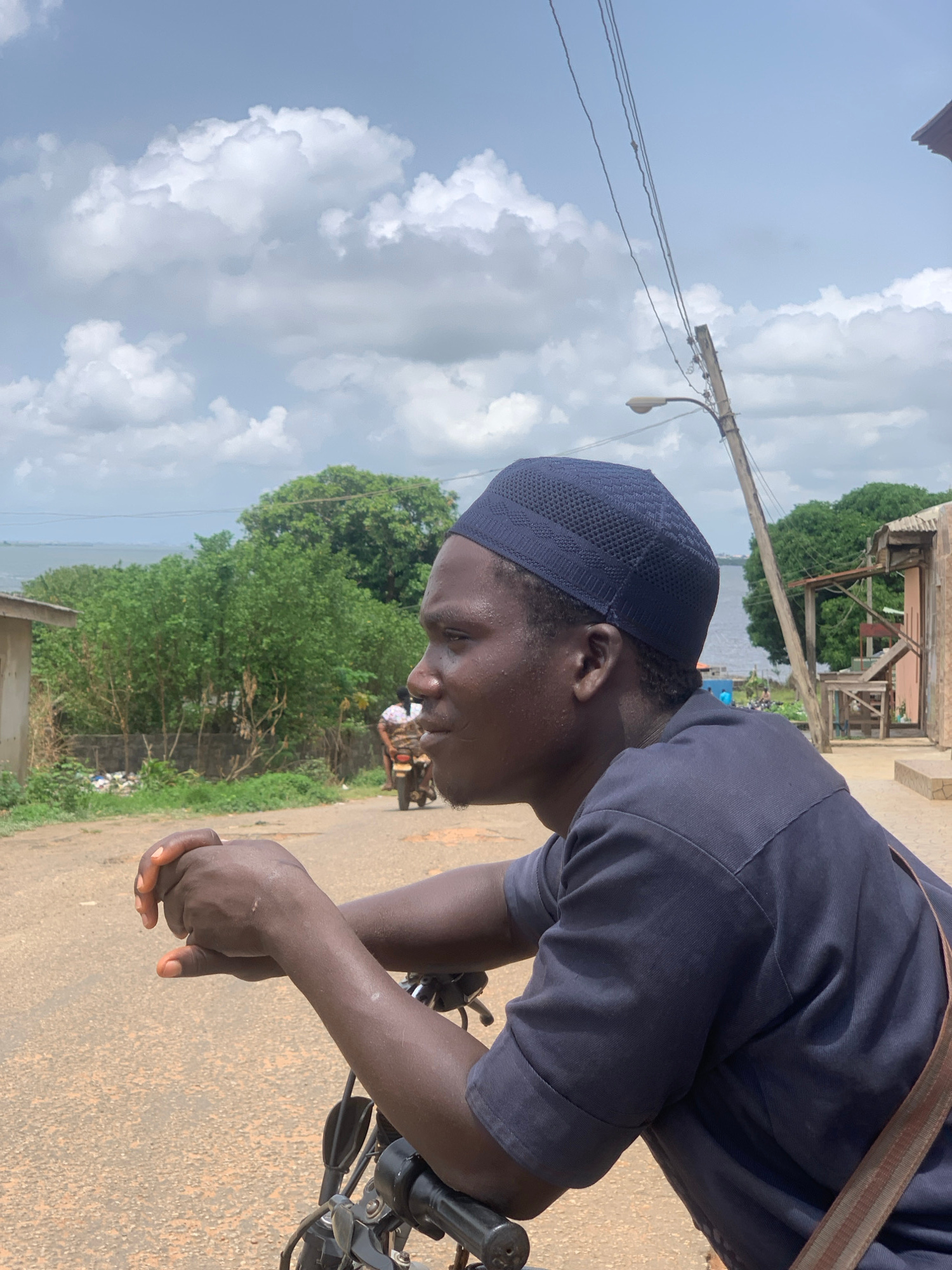 A person wearing a dark blue kufi cap and matching short-sleeved shirt is leaning over the handlebars of a motorcycle. The individual's hands are clasped together on the handlebars. In the background,…read more