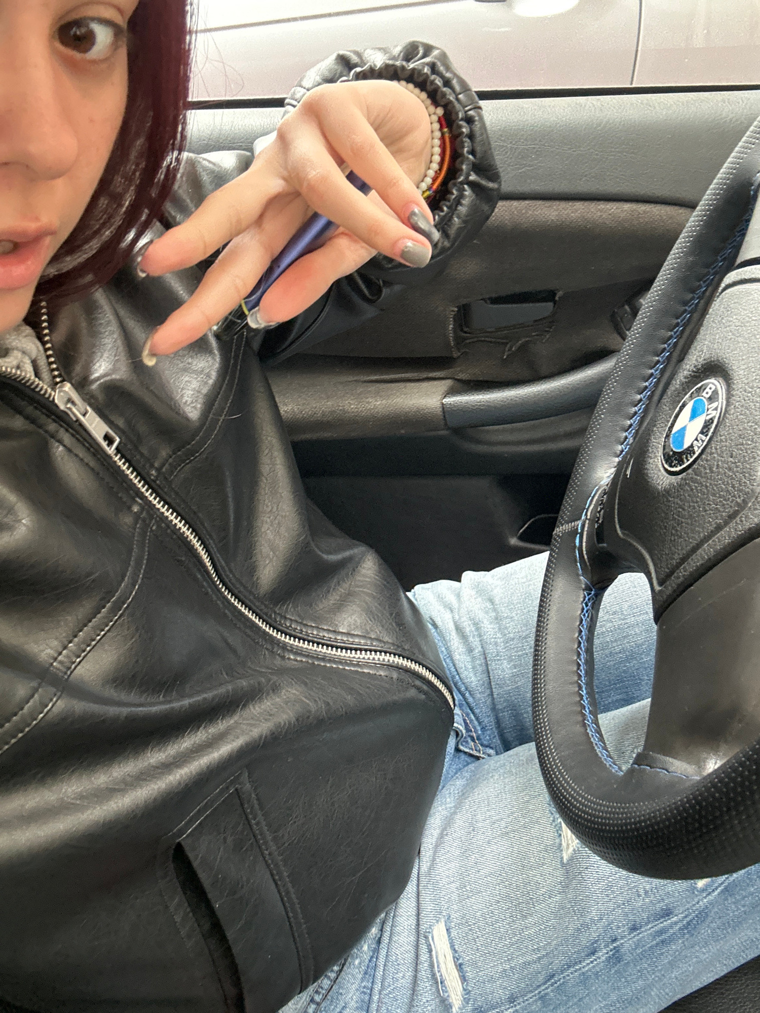 A person is in the driver's seat of a BMW vehicle. The steering wheel is visible, with the BMW logo prominently displayed. The person is wearing a black leather jacket and blue jeans with a rip near t…read more