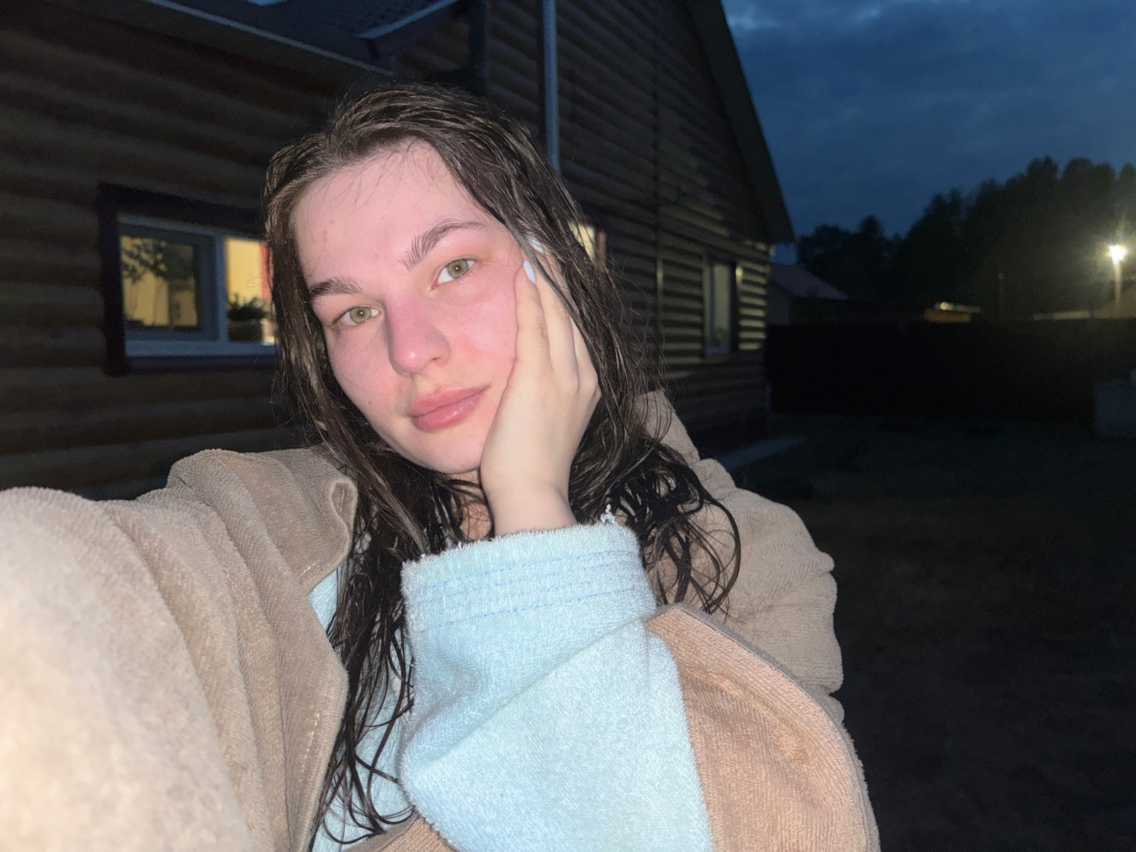 A young woman is depicted in a close-up, slightly upward-angled shot, looking directly at the viewer. Her dark, damp hair, possibly recently washed, frames her face. She has light-colored eyes and a n…read more