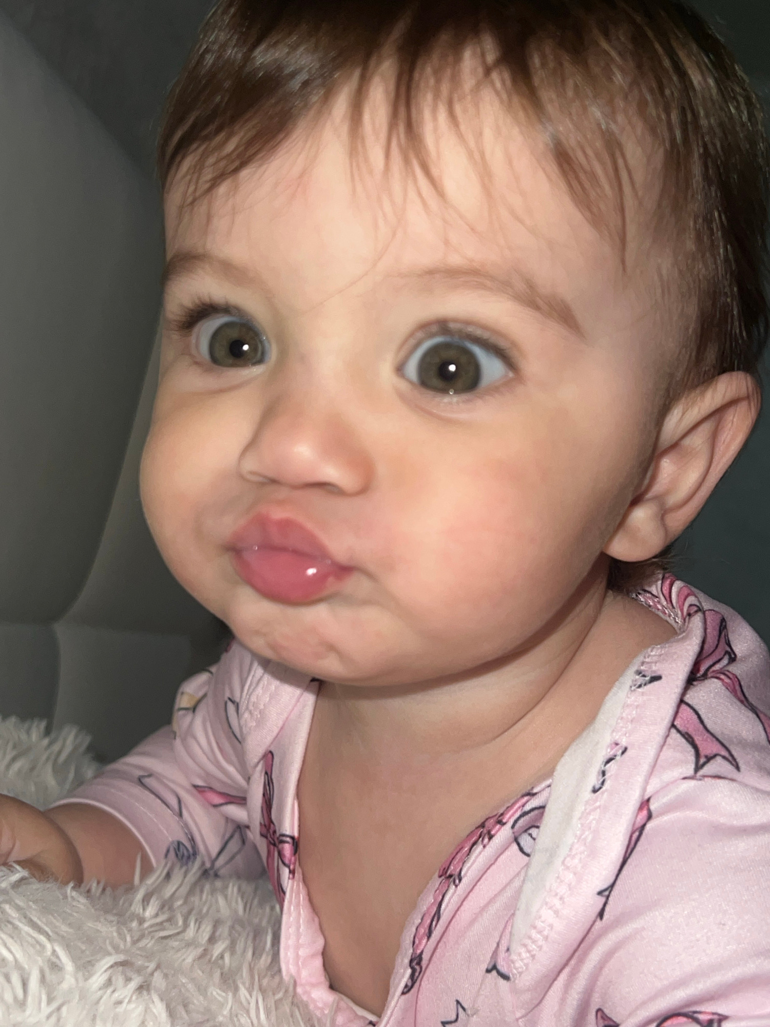 A close-up, slightly tilted, medium-shot photograph depicts a baby with light skin, brown hair, and hazel eyes. The baby is wearing pink pajamas with a unicorn pattern. The baby's lips are pursed in a…read more