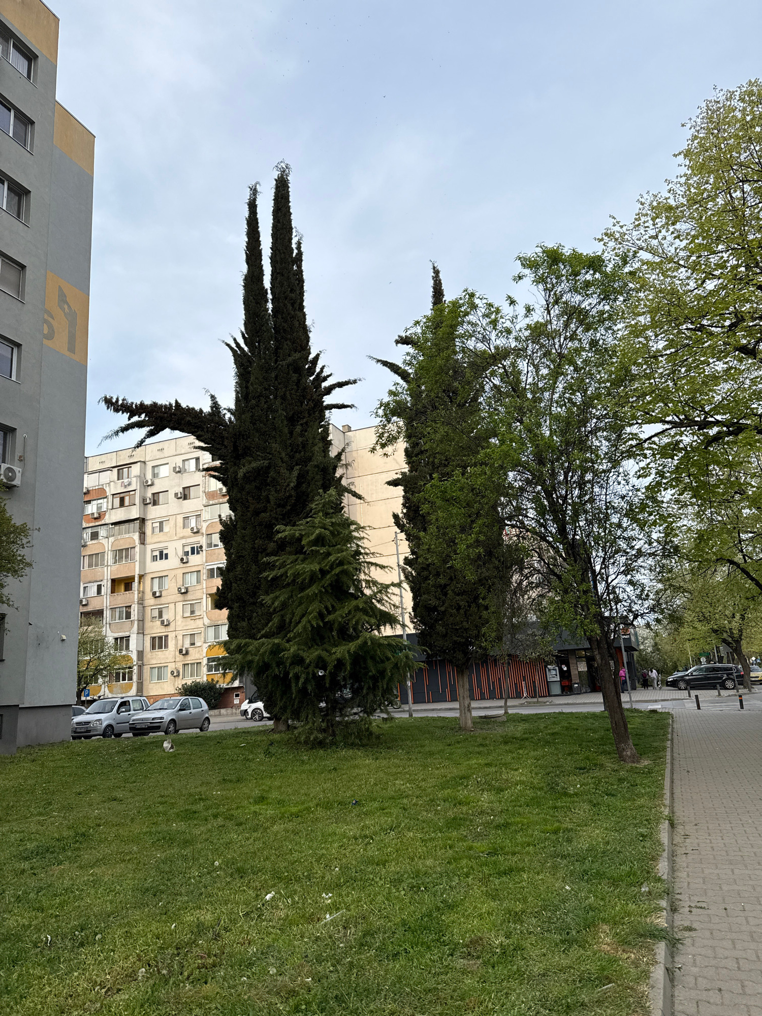 The image depicts an urban landscape in Stara Zagora, Bulgaria, under an overcast sky during daytime. A wide, well-maintained grassy area occupies the right side of the frame, bordered by a paved side…read more