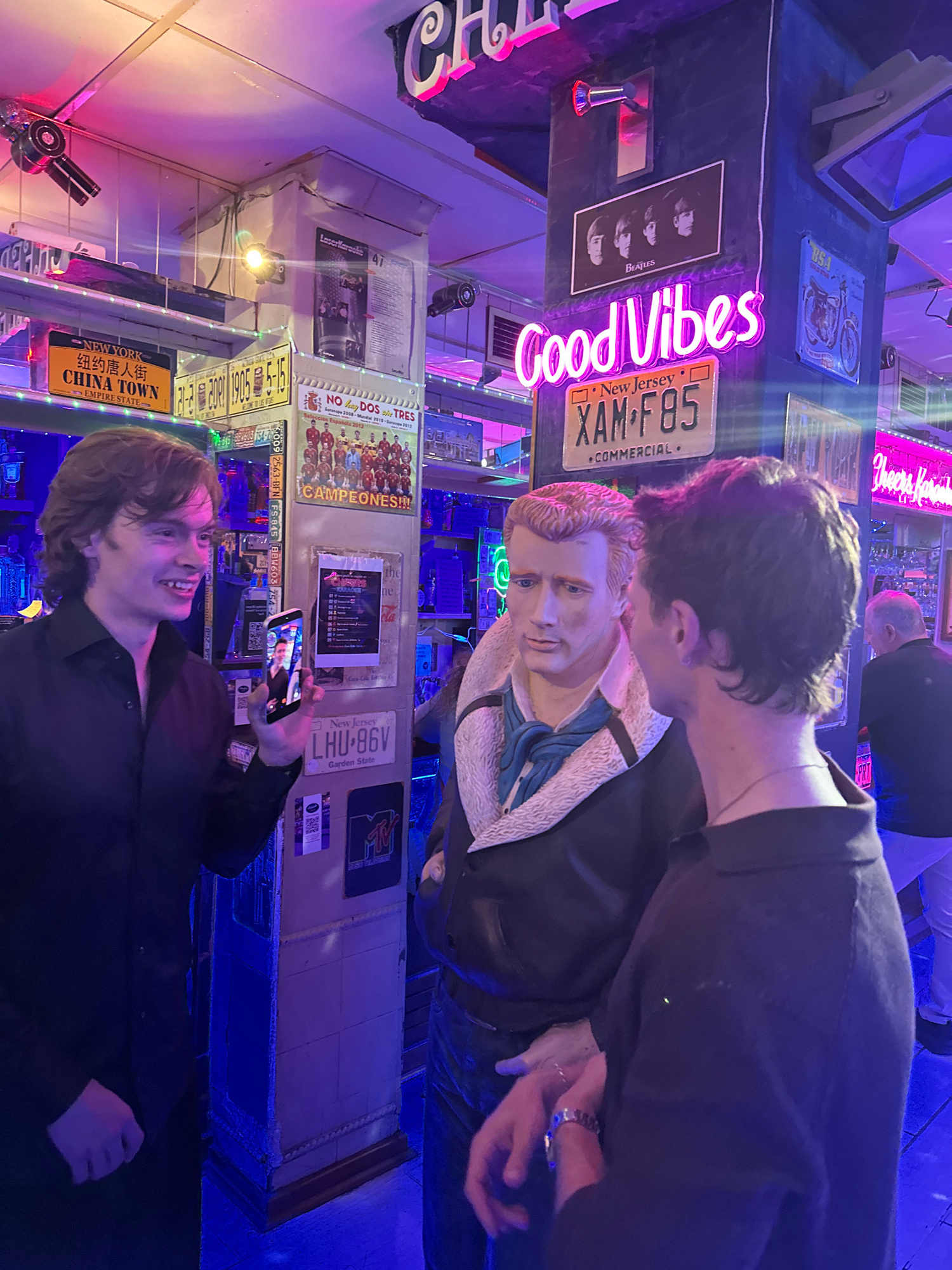 The image depicts the interior of a bar or entertainment venue. The walls are adorned with a collection of license plates, posters, and neon signs, including one that reads "Good Vibes" and a photo of…read more