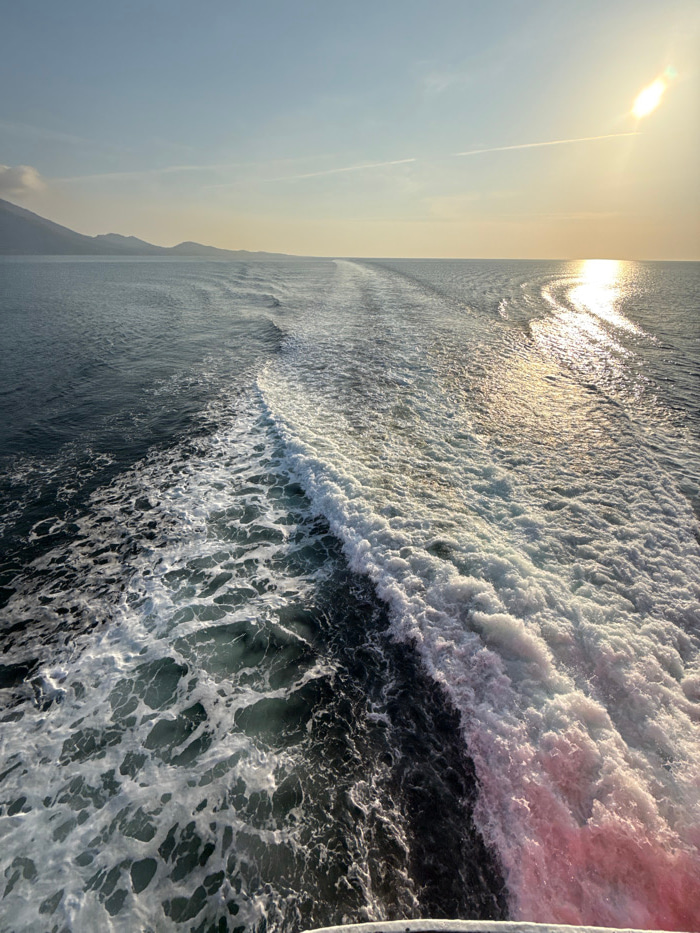 A broad stern view from a moving vessel depicts its wake across open water near Palaiopoli, Greece. The wake forms a wide, turbulent trail of white foam and disturbed dark blue-green water extending fâŚread more