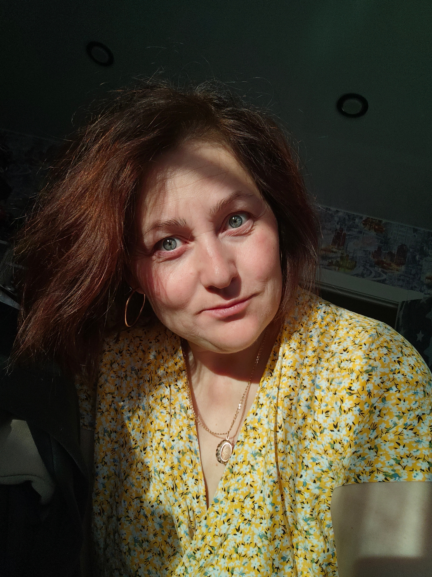 A woman with red hair and blue eyes is looking at the camera with a slight smile. She is wearing a yellow floral dress and a gold necklace with a pendant. She also has gold hoop earrings. The lighting…read more