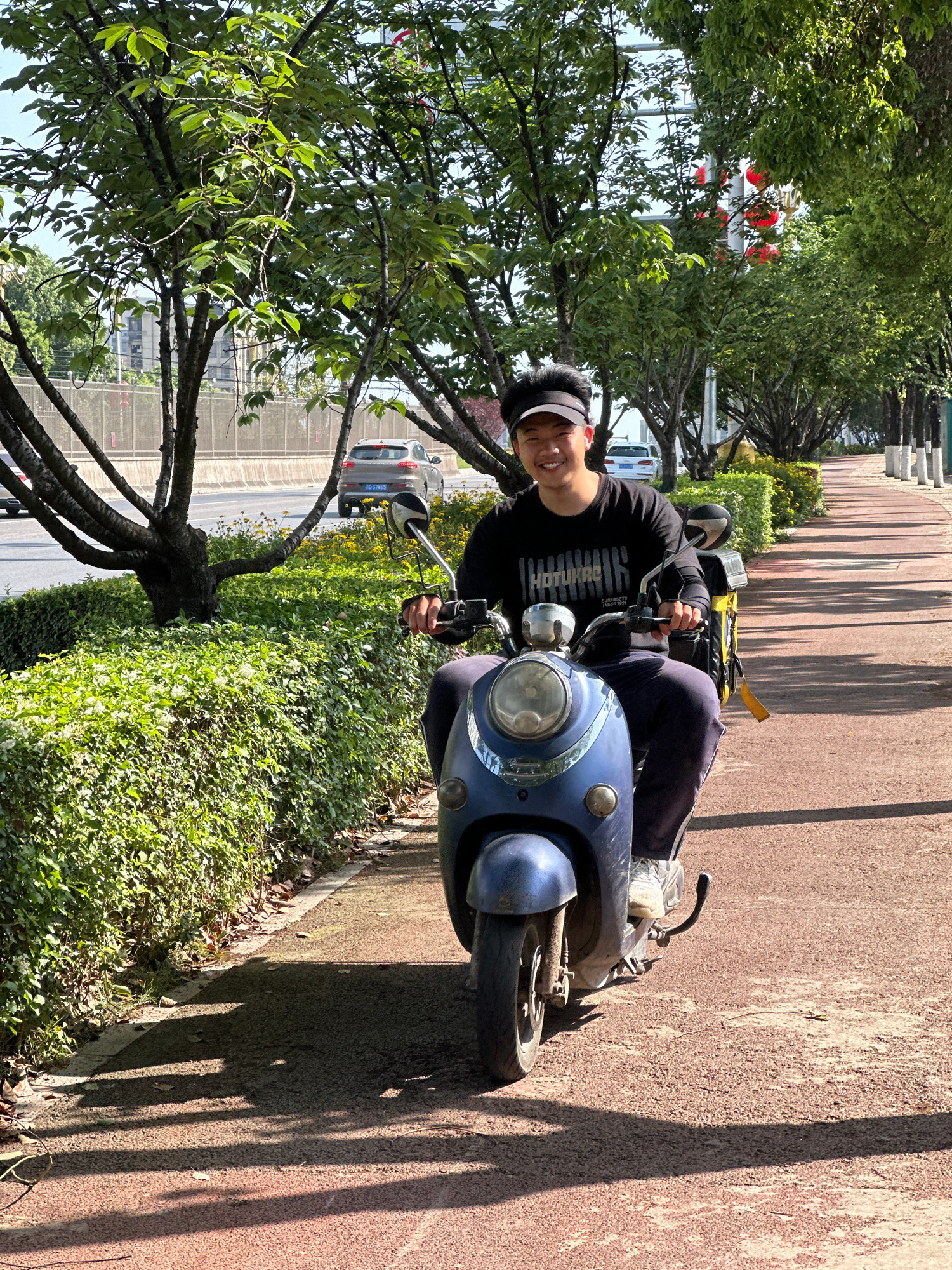 A young Asian man is seated on a blue scooter on a bright, sunny day. He is smiling broadly and looking towards the camera, holding the handlebars. He wears a black short-sleeved t-shirt with white te…read more
