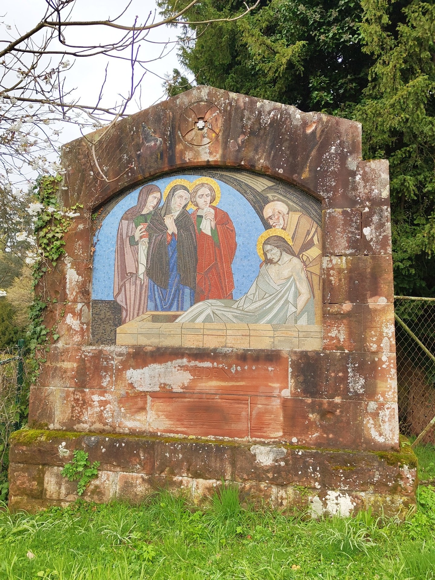 The image depicts a memorial or shrine located outdoors. The main structure is made of weathered, reddish-brown stone, possibly sandstone, with visible signs of aging such as moss and lichen growth. I…read more
