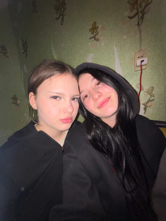 Two young females are depicted in a close-up indoor photograph taken in Foki, Russia. The female on the left has light brown hair, fair skin, and wears large silver hoop earrings and a black zippered…read more