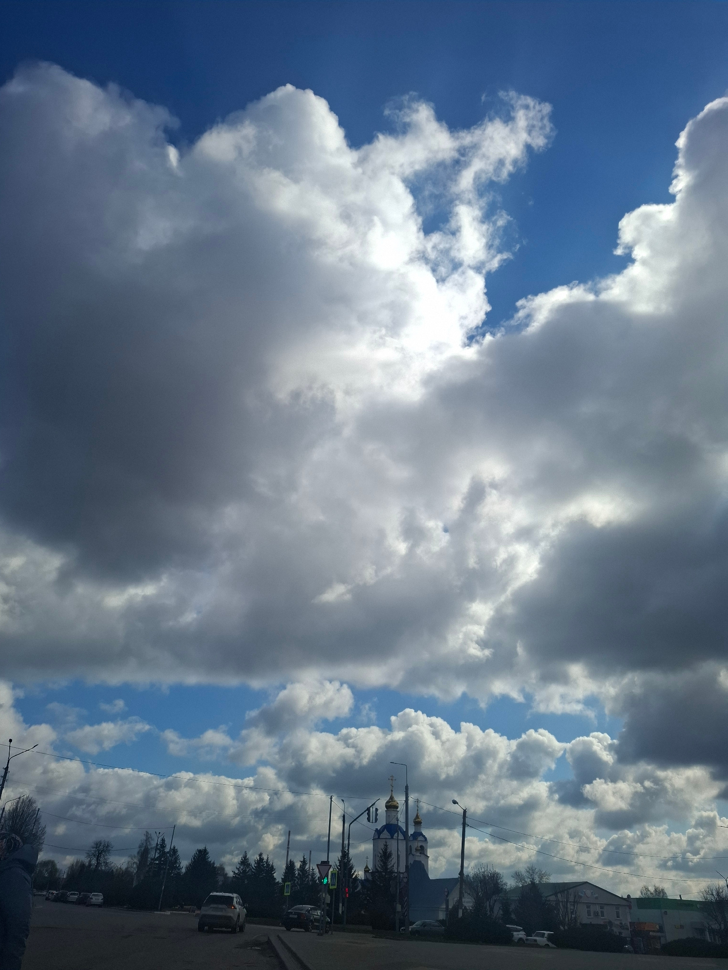 The image captures a dynamic sky dominated by large, billowing clouds and patches of deep blue. The sky occupies a significant portion of the frame, showcasing a mix of bright white cumulus clouds, il…read more