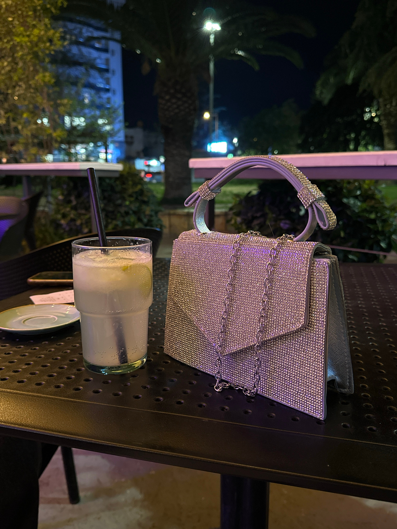 At night in Polje, Montenegro, a bejeweled handbag rests on a dark, perforated metal table. A glass of liquid with ice and a black straw stands nearby on a small plate. In the background, buildings an…read more