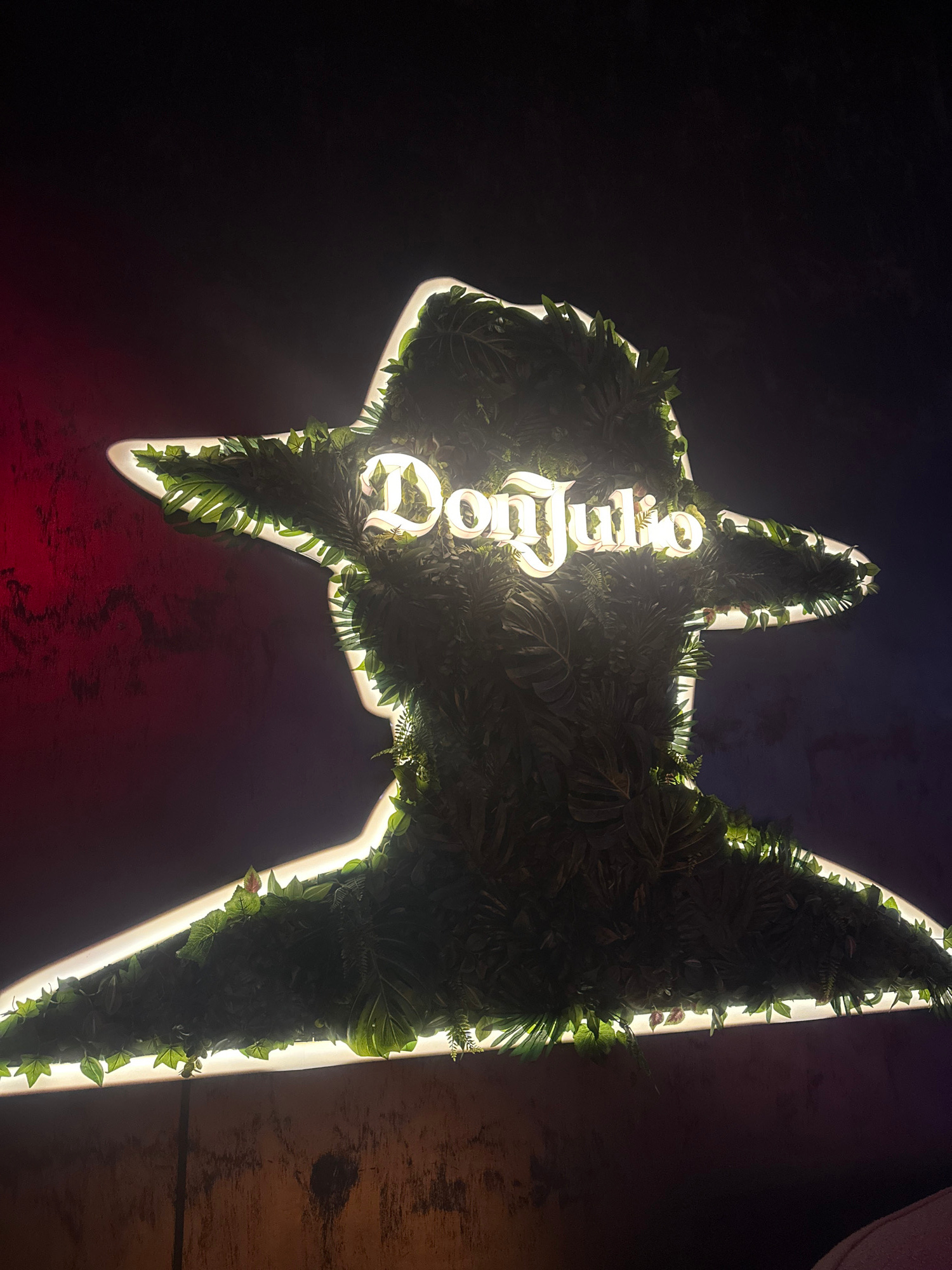 A lit sign, shaped like an abstract figure with two upward points, is partially covered with greenery. The sign reads "Quinto," positioned vertically. The background consists of a dark wall with a red…read more